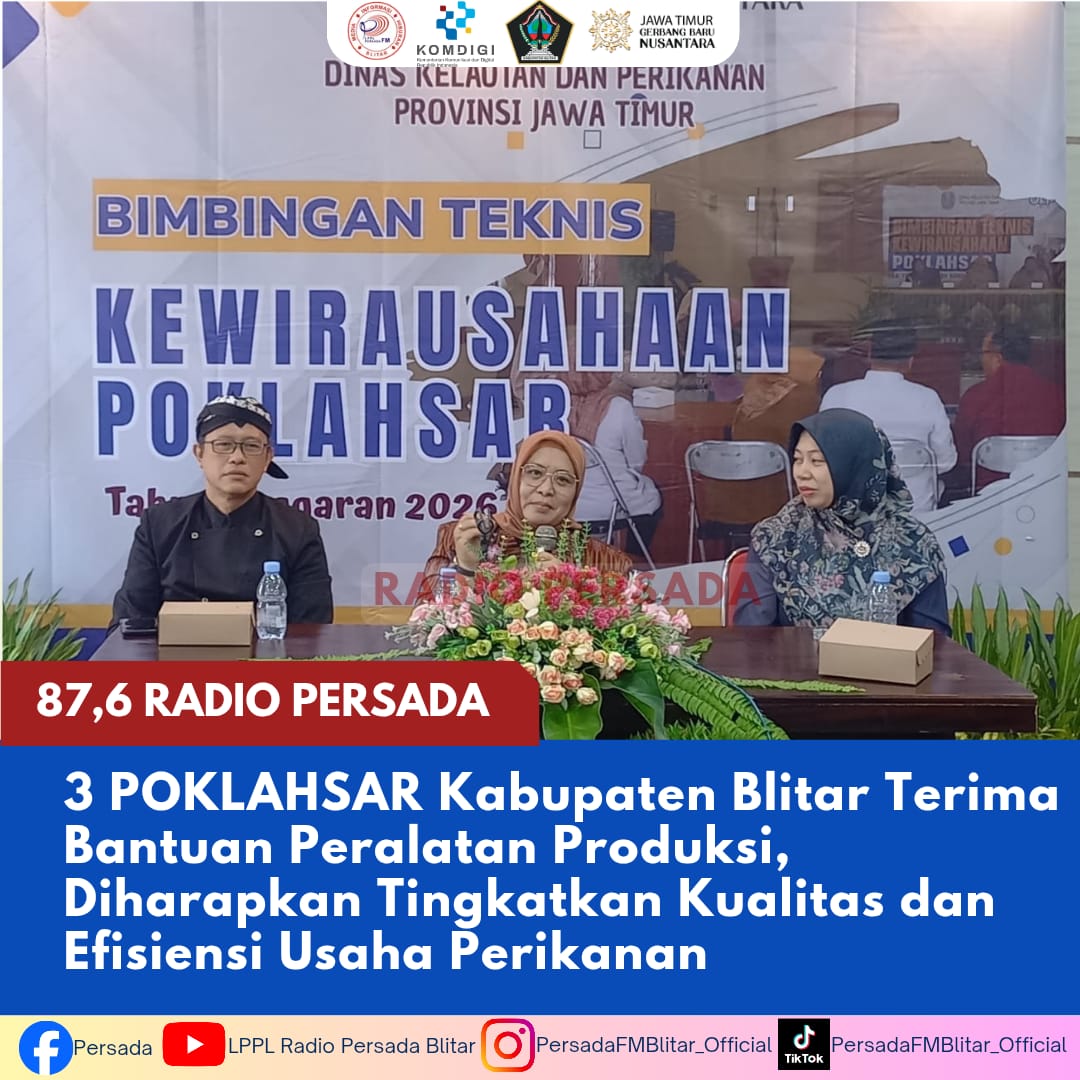 PersadaFM — Penguatan pelaku usaha perikanan di Kabupaten Blitar dilakukan melalui penyaluran bantuan peralatan produksi kepada kelompok pengolah dan pemasar (POKLAHSAR), Selasa (21/04/2026). Program ini difasilitasi oleh Dinas Kelautan dan Perikanan Provinsi Jawa Timur bersama Dinas Peternakan dan Perikanan Kabupaten Blitar.