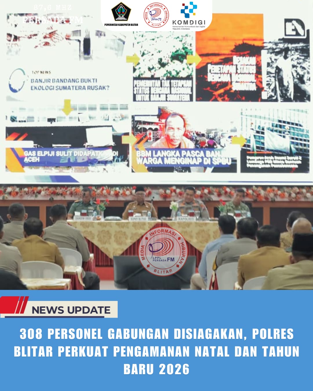 PersadaFM — Polres Blitar menyiapkan pengamanan terpadu menjelang perayaan Natal dan Tahun Baru (Nataru) 2025/2026 dengan melibatkan total 308 personel gabungan dari berbagai unsur. Langkah ini dilakukan untuk memastikan situasi keamanan, kelancaran lalu lintas, serta kenyamanan masyarakat selama momentum libur akhir tahun.