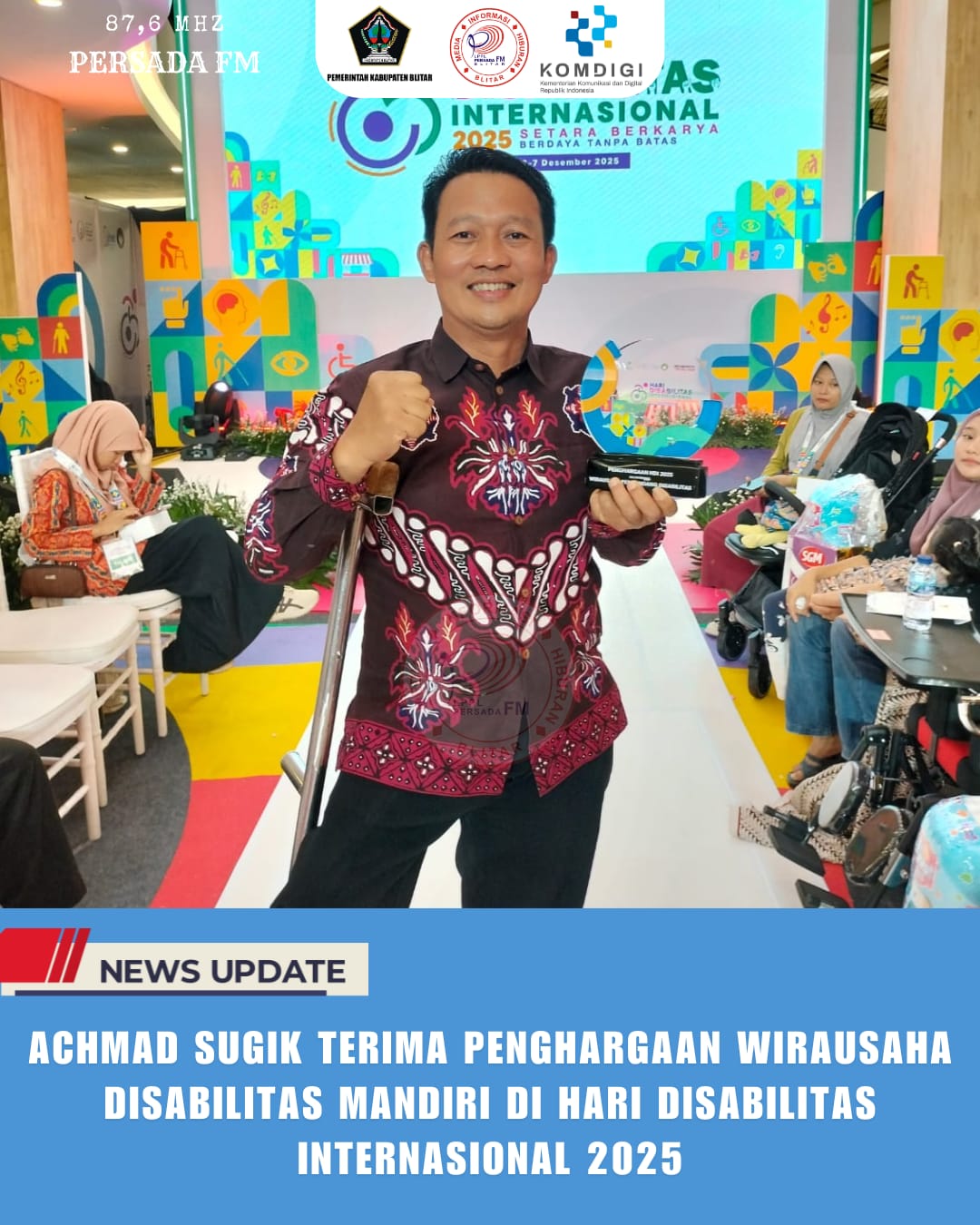 PersadaFM – Ketua National Paralympic Committee Indonesia (NPCI) Kabupaten Blitar, Achmad Sugik, menerima penghargaan dari Kementerian Sosial Republik Indonesia dalam rangka Hari Disabilitas Internasional (HDI) 2025, yang digelar pada 3 Desember di FX Jakarta. Penghargaan ini diberikan di bidang kewirausahaan disabilitas mandiri, sebagai bentuk apresiasi terhadap upaya memberdayakan penyandang disabilitas melalui usaha yang mandiri.