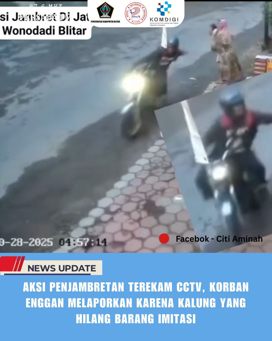 PersadaFM – Aksi penjambretan di Desa Jaten, Kecamatan Wonodadi, Kabupaten Blitar terekam dalam kamera cctv. Meski telah dilengkapi bukti, korban enggan melaporkan kejadian ini karena kalung yang dijambret merupakan kalung imitasi.