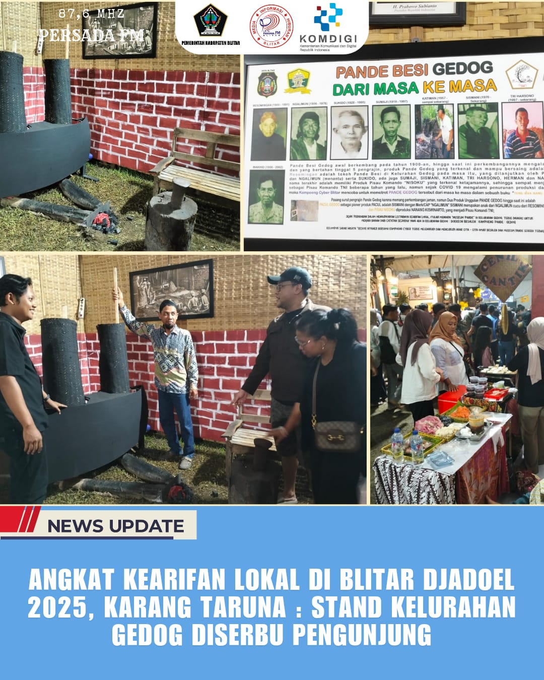 PersadaFM – Stand Kelurahan Gedog menjadi salah satu spot paling ramai dalam gelaran Blitar Djadoel 2025 yang berlangsung 18–22 Juni 2025. Stand ini dipadati pengunjung setiap harinya, berkat penyajian unik yang mengangkat kearifan lokal berupa proses pembuatan pande besi tradisional serta ragam kuliner jadul.
