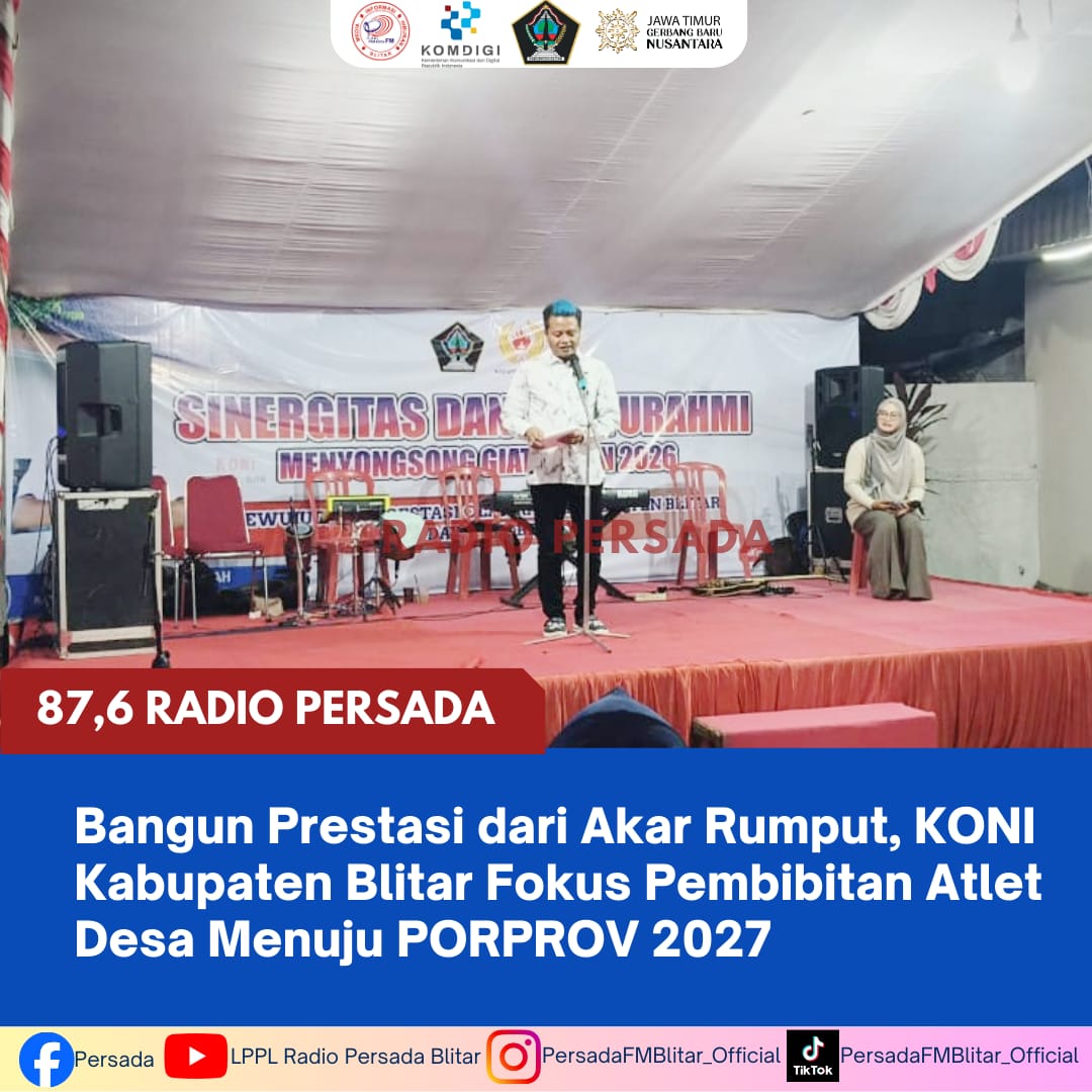 PersadaFM — KONI Kabupaten Blitar menaruh perhatian serius pada pembibitan atlet dari tingkat desa sebagai strategi jangka panjang untuk meningkatkan prestasi olahraga daerah pada ajang Pekan Olahraga Provinsi (PORPROV) Jawa Timur 2027. Komitmen tersebut disampaikan dalam rapat koordinasi pengurus KONI dan ketua cabang olahraga se-Kabupaten Blitar, Minggu (4/1/2026).