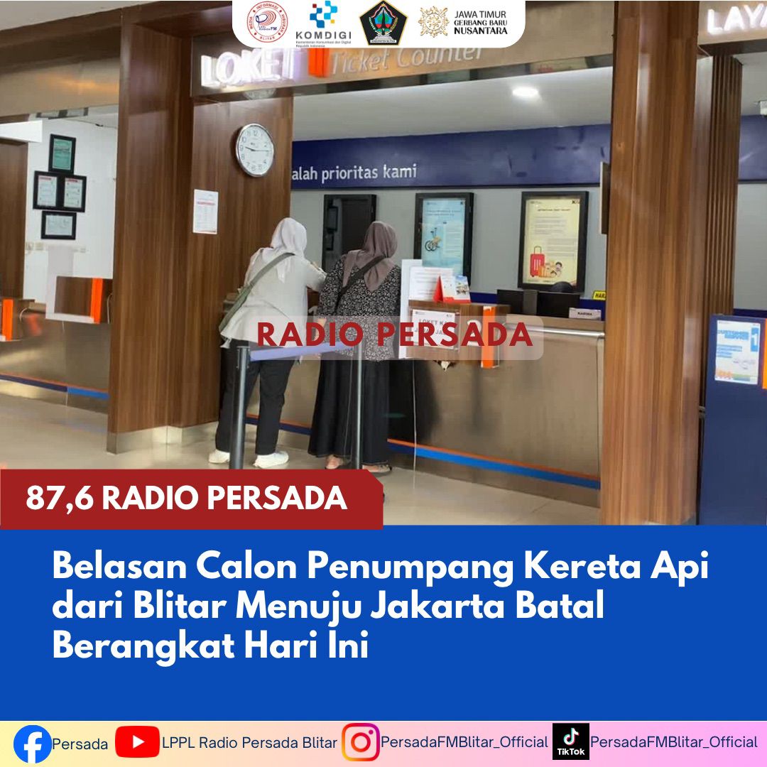 PersadaFM – Sebanyak 13 calon penumpang Kereta Api Singasari relasi Blitar – Pasarsenen batal berangkat hari ini. Hal itu lantaran perjalanan kereta yang dihentikan akibat tabrakan Kereta Api Argo Bromo Anggrek dengan KRL Tokyo Metro di Bekasi.