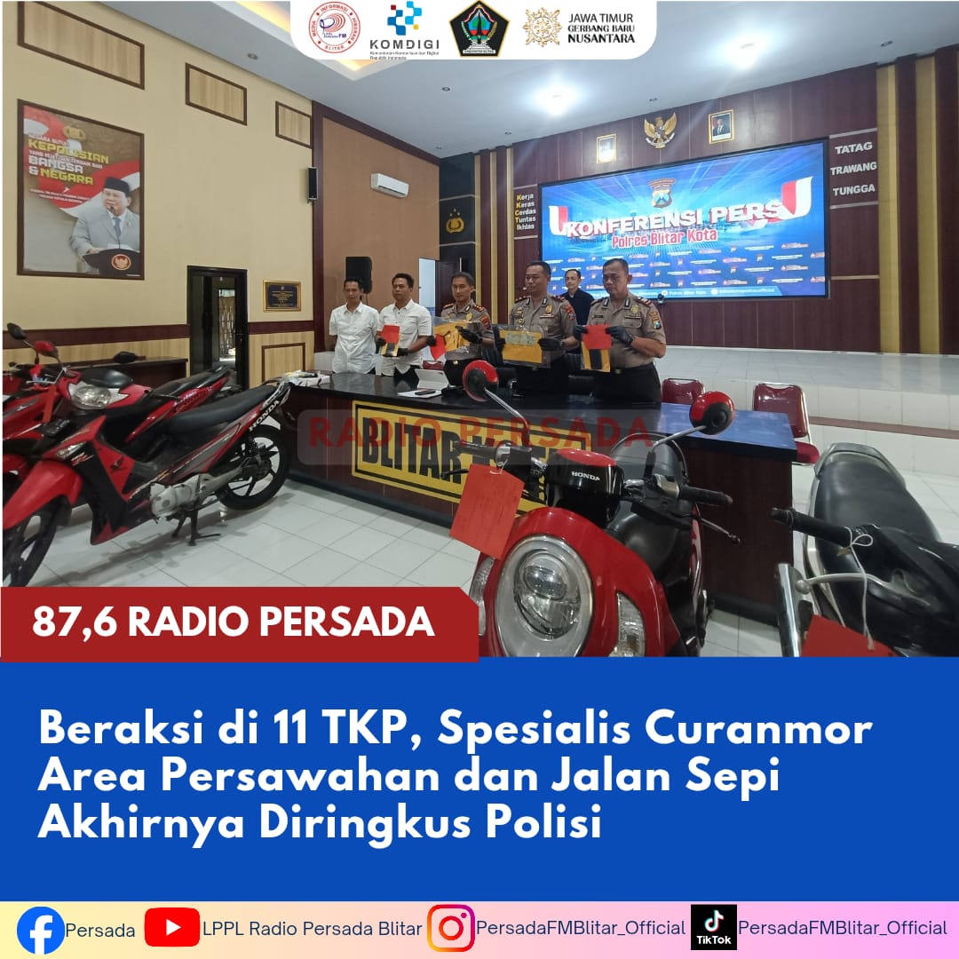 PersadaFM – Polres Blitar Kota berhasil mengungkap kasus pencurian kendaraan bermotor (curanmor) lintas wilayah yang meresahkan masyarakat. Dua pelaku yang dikenal sebagai spesialis pencurian di area persawahan dan jalan sepi diringkus setelah terbukti beraksi di 11 tempat kejadian perkara (TKP) sejak September 2025 hingga April 2026.