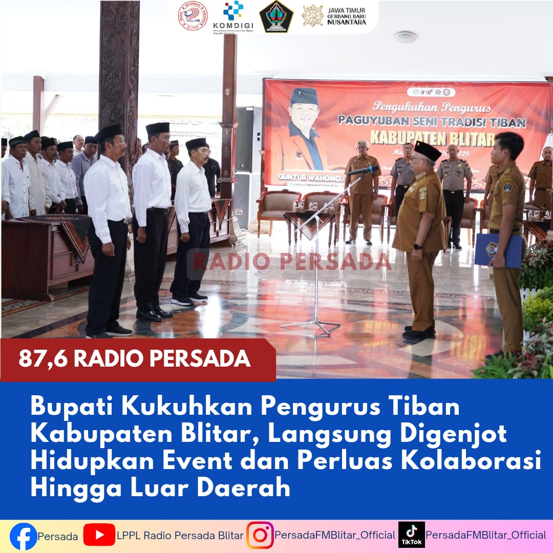 PersadaFM — Pengurus Seni Tradisional Tiban Kabupaten Blitar periode 2026–2029 resmi dikukuhkan Bupati Blitar di Pendopo Ronggo Hadinegoro, Senin (27/4).