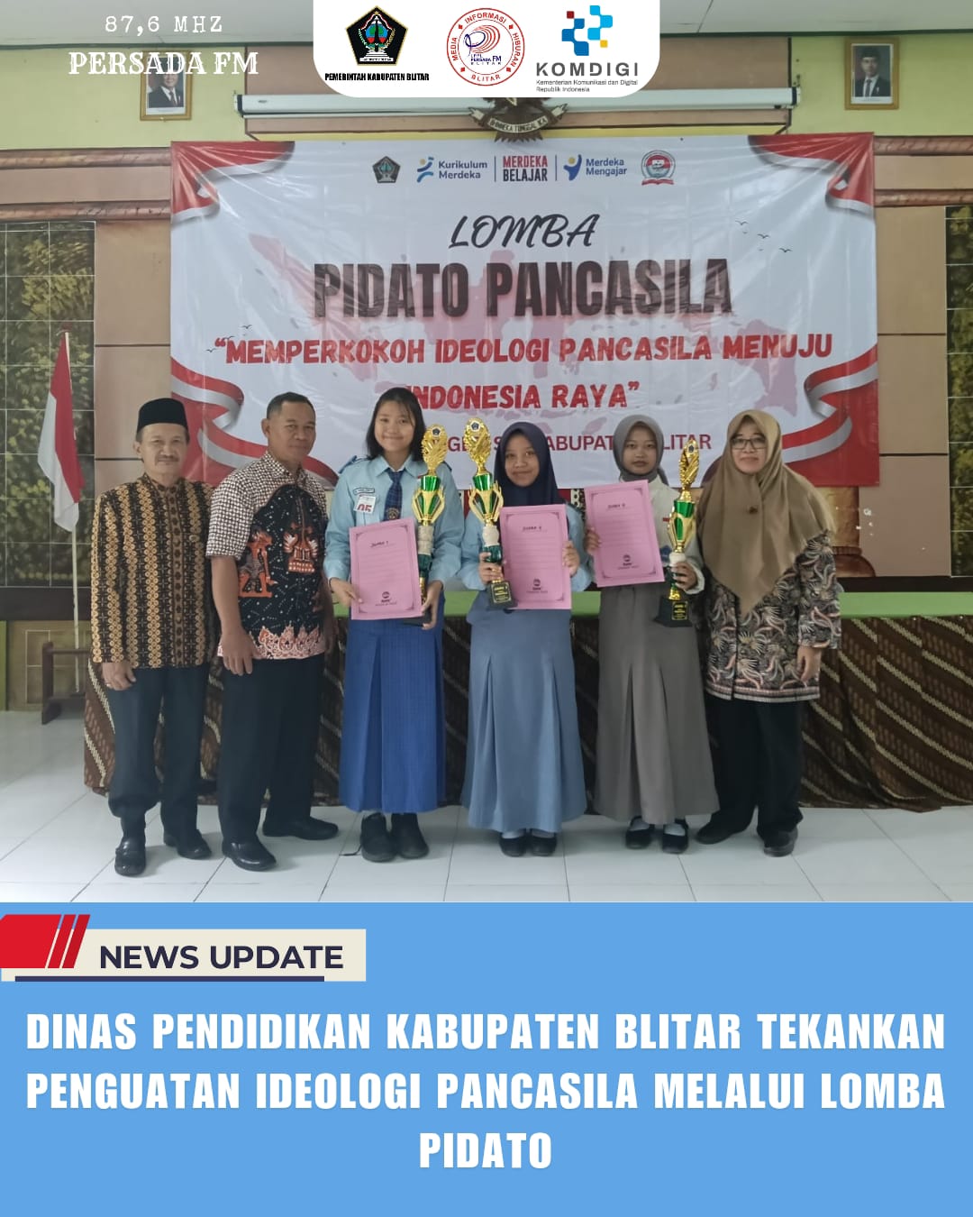PersadaFM – Dinas Pendidikan Kabupaten Blitar menegaskan pentingnya penguatan ideologi Pancasila di kalangan pelajar. Hal ini diwujudkan melalui lomba pidato antar SMP Negeri se-Kabupaten Blitar yang diselenggarakan MGMP Pendidikan Pancasila dengan mengusung tema “Memperkokoh Ideologi Pancasila Menuju Indonesia Raya.”