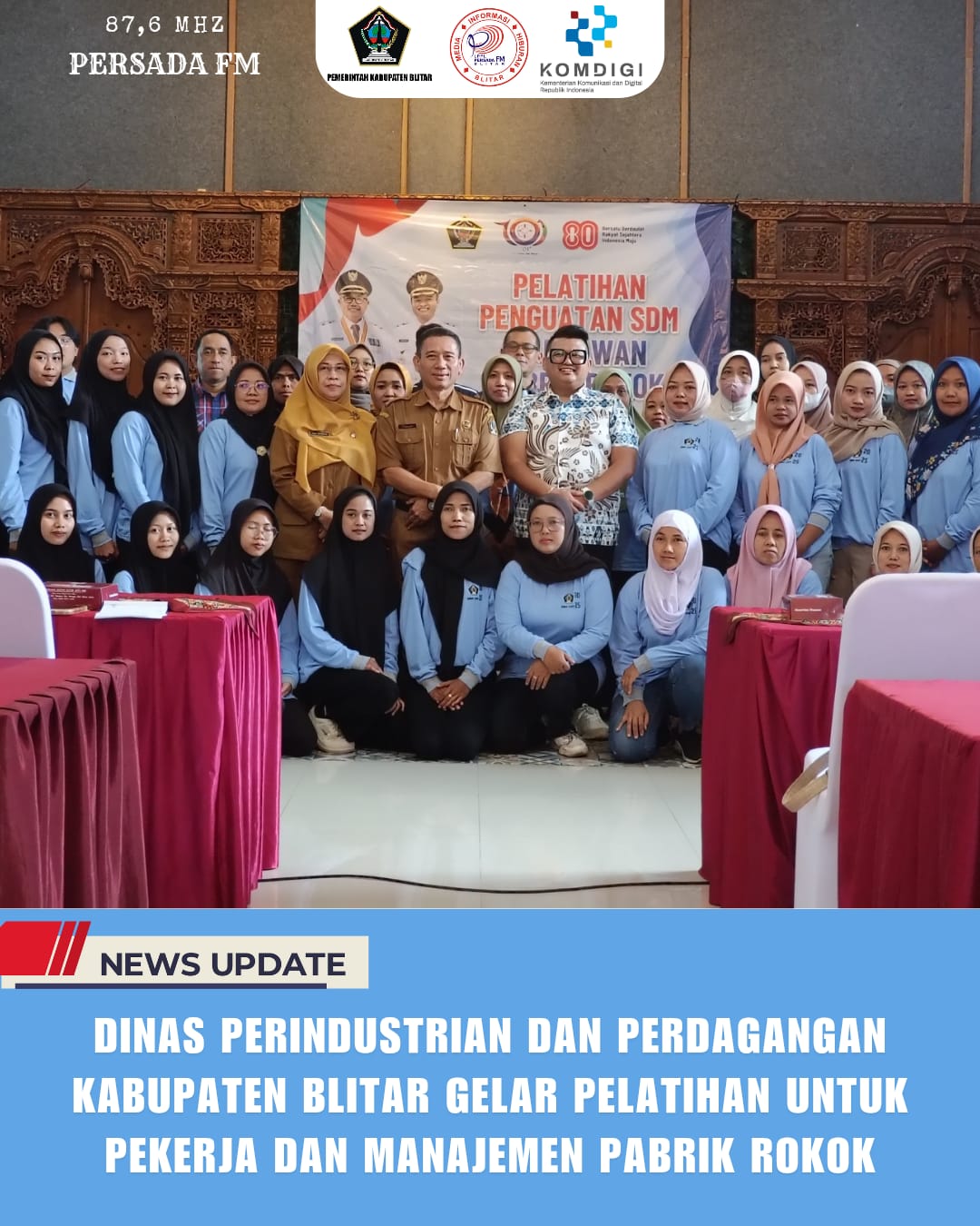PersadaFM – Dinas Perindustrian dan Perdagangan Kabupaten Blitar mengadakan kegiatan pelatihan bagi pekerja dan manajemen pabrik rokok. Kegiatan ini berlangsung di Pendopo Han Asta Sih, Selasa, 19 Agustus 2025.