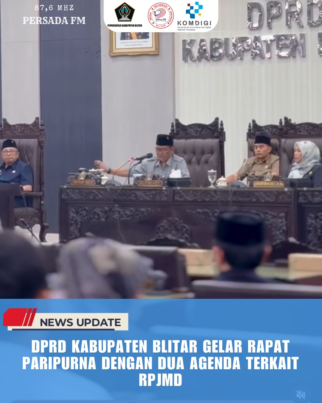 PersadaFM – Dewan Perwakilan Rakyat Daerah (DPRD) Kabupaten Blitar kembali laksanakan Rapat Paripurna dengan dua agenda penting di Graha Paripurna DPRD Kabupaten Blitar, Rabu (28/05/2025). Pada rapat kali ini, dilaksanakan penyampaian jawaban Bupati Blitar atas pandangan umum fraksi-fraksi DPRD terhadap Rancangan Peraturan Daerah (Ranperda) tentang Rencana Pembangunan Jangka Menengah Daerah (RPJMD) Kabupaten Blitar Tahun 2025–2029 serta pembacaan Surat Keputusan DPRD tentang susunan keanggotaan panitia khusus (pansus) pembahas RPJMD.