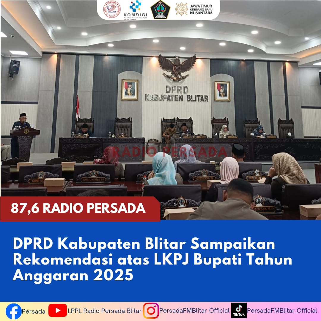 PersadaFM — DPRD Kabupaten Blitar menetapkan dan menyampaikan 20 rekomendasi strategis atas Laporan Keterangan Pertanggungjawaban (LKPJ) Bupati Tahun Anggaran 2025 dalam rapat paripurna yang digelar Jumat (24/4/2026).