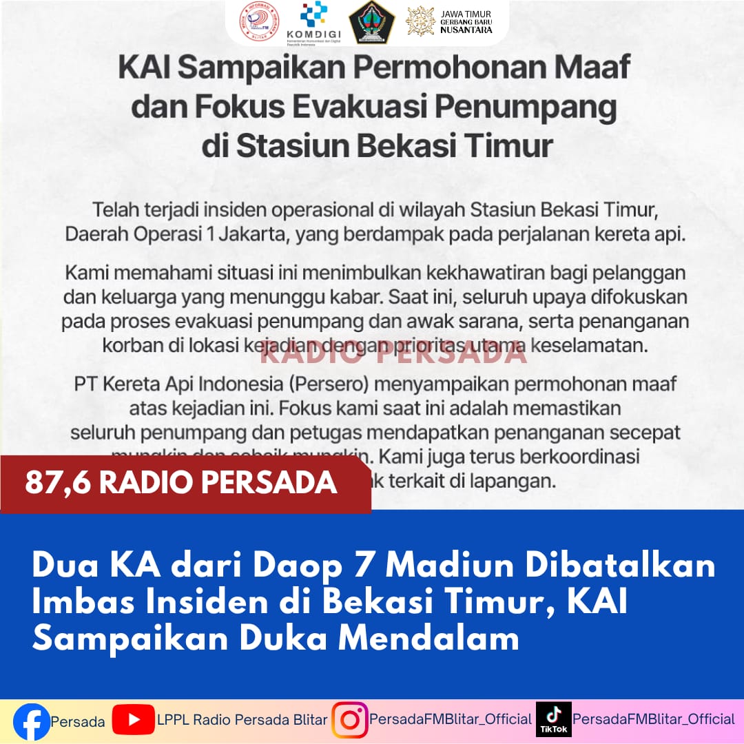 PersadaFM – PT Kereta Api Indonesia (Persero) Daerah Operasi 7 Madiun menyampaikan duka mendalam atas insiden operasional yang terjadi di Stasiun Bekasi Timur, wilayah Daop 1 Jakarta, pada Senin (27/4/2026).