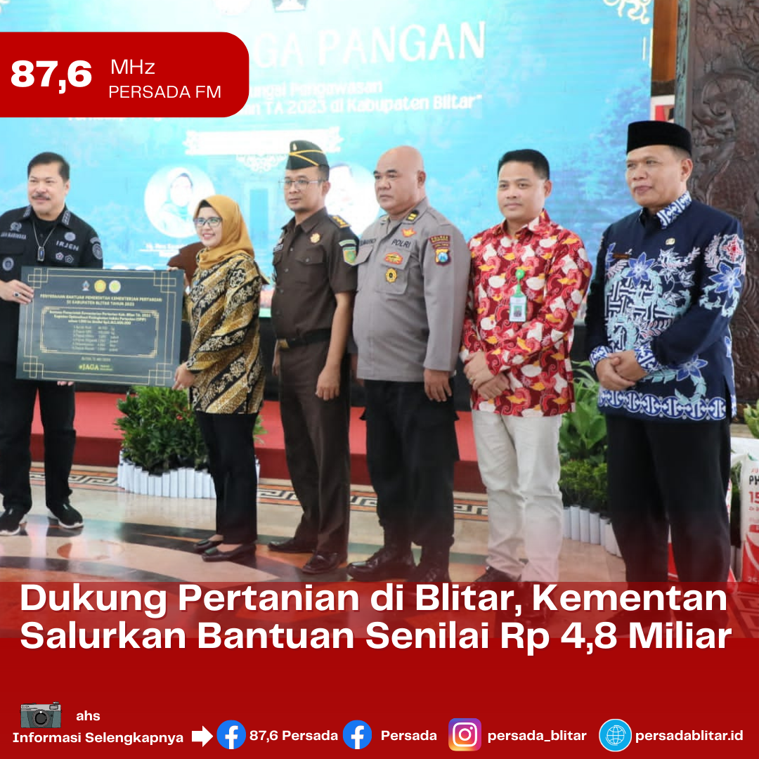 PersadaFM – Dalam rangka mendukung sektor pertanian di Kabupaten Blitar, Kementerian Pertanian RI menyalurkan bantuan kepada Pemkab Blitar senilai Rp 4.818.000.000. Kegiatan penerimaan, secara simbolis diterima langsung oleh Bupati Blitar Rini Syarifah di Pendopo RHN, (12/05/2023).