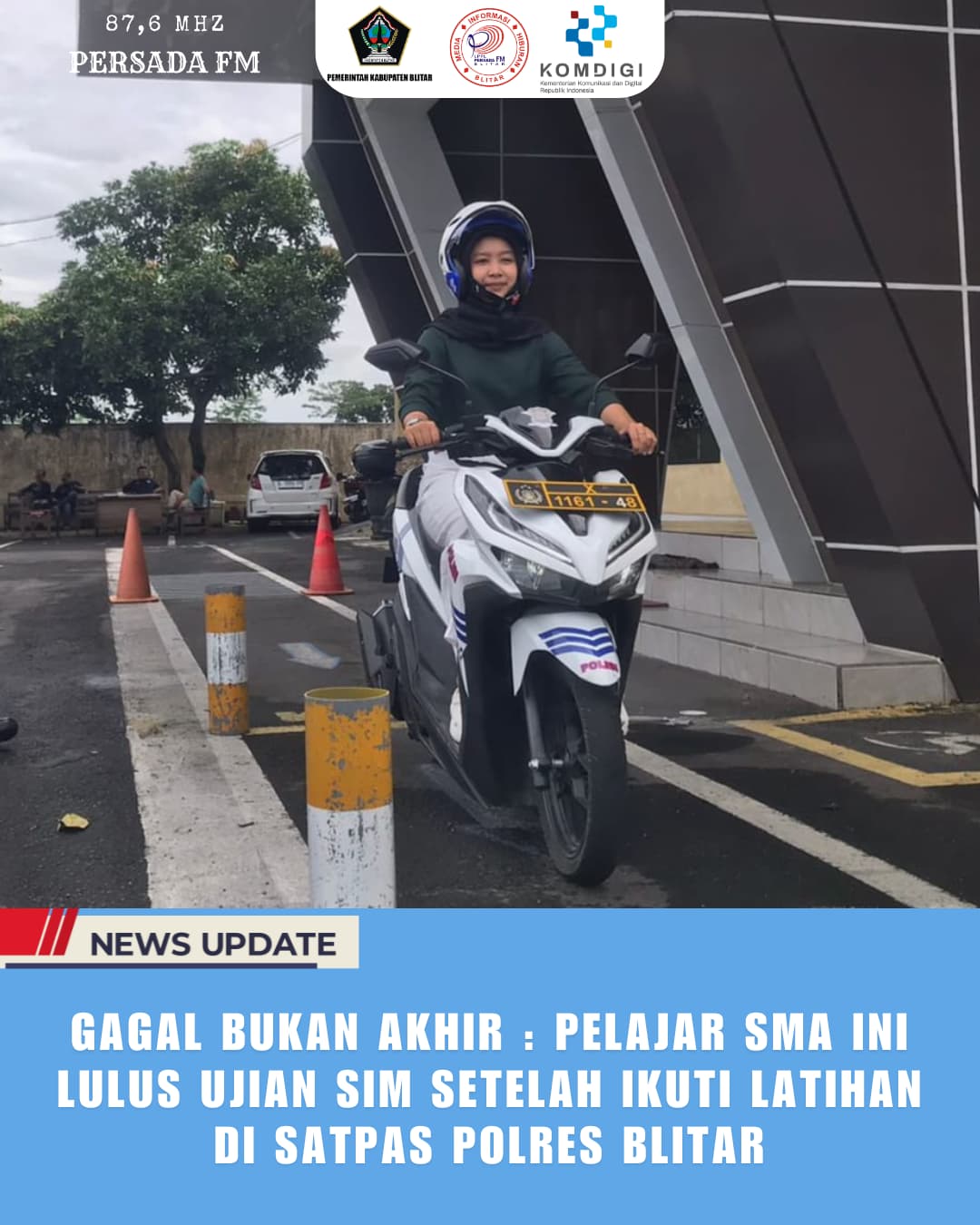 PersadaFM – Kegagalan dalam ujian praktik SIM tak membuat Aqila Rafifah (17), pelajar asal Desa Sumberasri, Kecamatan Nglegok, menyerah. Justru dari kegagalan itu, ia menemukan semangat baru hingga akhirnya berhasil meraih Surat Izin Mengemudi (SIM) C di Satpas Polres Blitar, Selasa (27/5/2025).