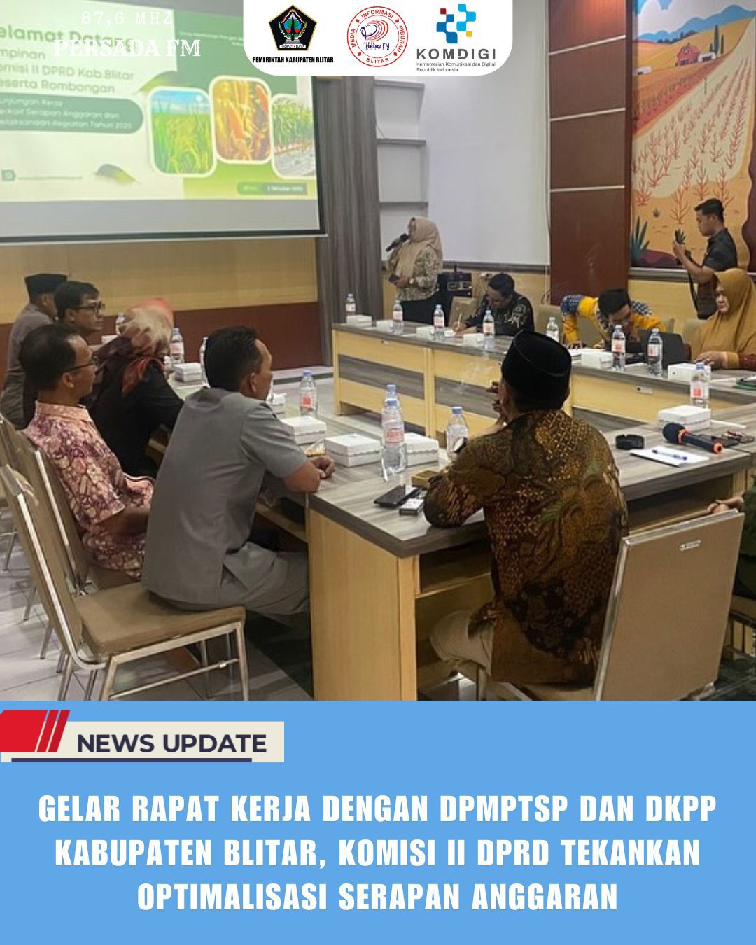 PersadaFM – Komisi II DPRD Kabupaten Blitar bersama Dinas Penanaman Modal dan PTSP serta Dinas Ketahanan Pangan dan Pertanian Kabupaten Blitar melaksanakan Rapat Kerja serapan anggaran dan pelaksanaan kegiatan tahun 2025, Kamis (02/10/2025). Rapat dipimpin oleh Ketua Komisi II DPRD Kabupaten Blitar, Lutfi Aziz.
