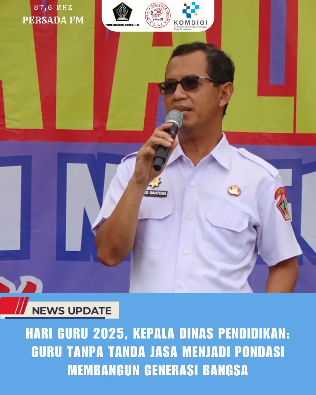 PersadaFM – Bertepatan dengan hari Guru, 25 November 2025 Kepala Dinas Pendidikan Kabupaten Blitar sampaikan apresiasi dan kebanggaan terhadap tenaga didik di Kabupaten Blitar. Kepala Dinas Pendidikan Kabupaten Blitar, Agus Santoso ungkapkan jika guru sebagai pahlawan tanpa tanda jasa telah mampu memberikan pendidikan yang bermutu selama ini.
