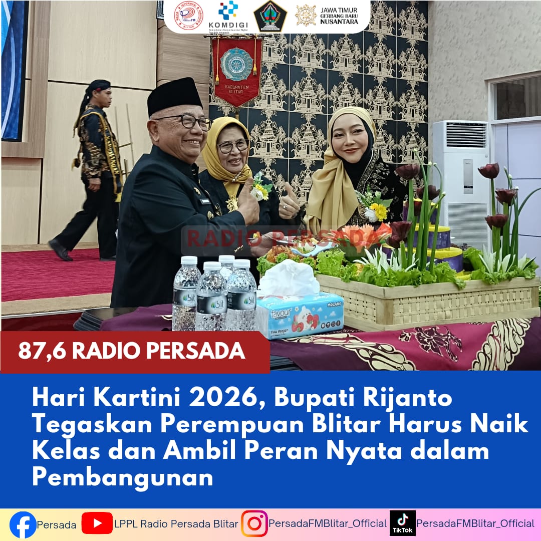 PersadaFM — Peringatan Hari Kartini 2026 di Kabupaten Blitar dimanfaatkan sebagai momentum penguatan peran perempuan dalam pembangunan daerah. Dalam kegiatan yang digelar di Ruang Rapat Candi Penataran, Selasa (21/4/2026), Bupati menegaskan bahwa perempuan Blitar harus mampu “naik kelas” dan mengambil peran nyata di berbagai sektor.