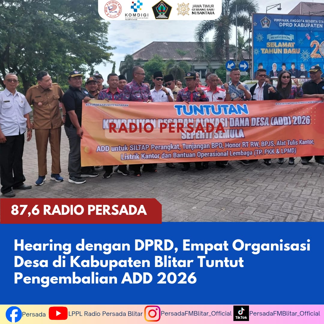 PersadaFM — Empat organisasi desa di Kabupaten Blitar menyampaikan tuntutan pengembalian Alokasi Dana Desa (ADD) Tahun Anggaran 2026 dalam hearing bersama DPRD Kabupaten Blitar, Senin (12/12). Keempat organisasi tersebut yakni Persaudaraan Kepala Desa Indonesia (PKDI), Asosiasi Permusyawaratan Desa Nasional (ABPEDNAS), Forum Sekretaris Desa Indonesia (Forsekdesi), dan Persatuan Perangkat Desa Indonesia (PPDI).
