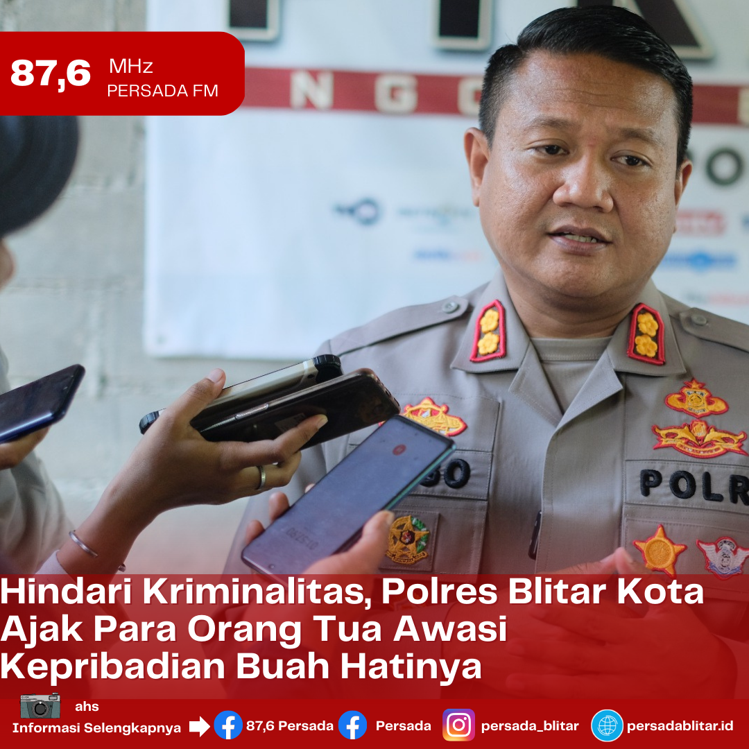 PersadaFM – Dalam upaya menghindari tindak kriminalitas di kalangan usia muda, jajaran Kepolisian Resor Blitar Kota mengajak seluruh para orang tua supaya pro aktif mengawasi kepribadian buah hatinya. Karena akhir-akhir ini sering muncul aksi milenial yang kurang baik. Kapolres Blitar Kota AKBP Argowiyono melalui Kasi Humas Polres Blitar Kota AKP Ahmad Rochan menyampaikan, pihaknya meminta kepada para orang tua untuk memastikan anaknya pada pukul 22.00 WIB sudah berada di rumah. Artinya, para orang tua minta lebih menyadari terkait dengan keselamatan anaknya.Mengingat saat ini banyak pengaruh dari luar maupun lingkungan sehingga para orang tua harus ekstra hati-hati dalam menjaga anaknya biar tidak sampai terjerumus ke arah pergaulan bebas. Lantaran masa depan anak tidak terlepas dari dorongan keluarga. Sebagai informasi, Polres Blitar Kota menghimbau kepada seluruh masyarakat tetap siaga, waspada dan memastikan anaknya tidak terlibat menjadi korban ataupun pelaku kejahatan jalanan, perang sarung, tawuran, balap liar dan genk motor. (ahs/riz)