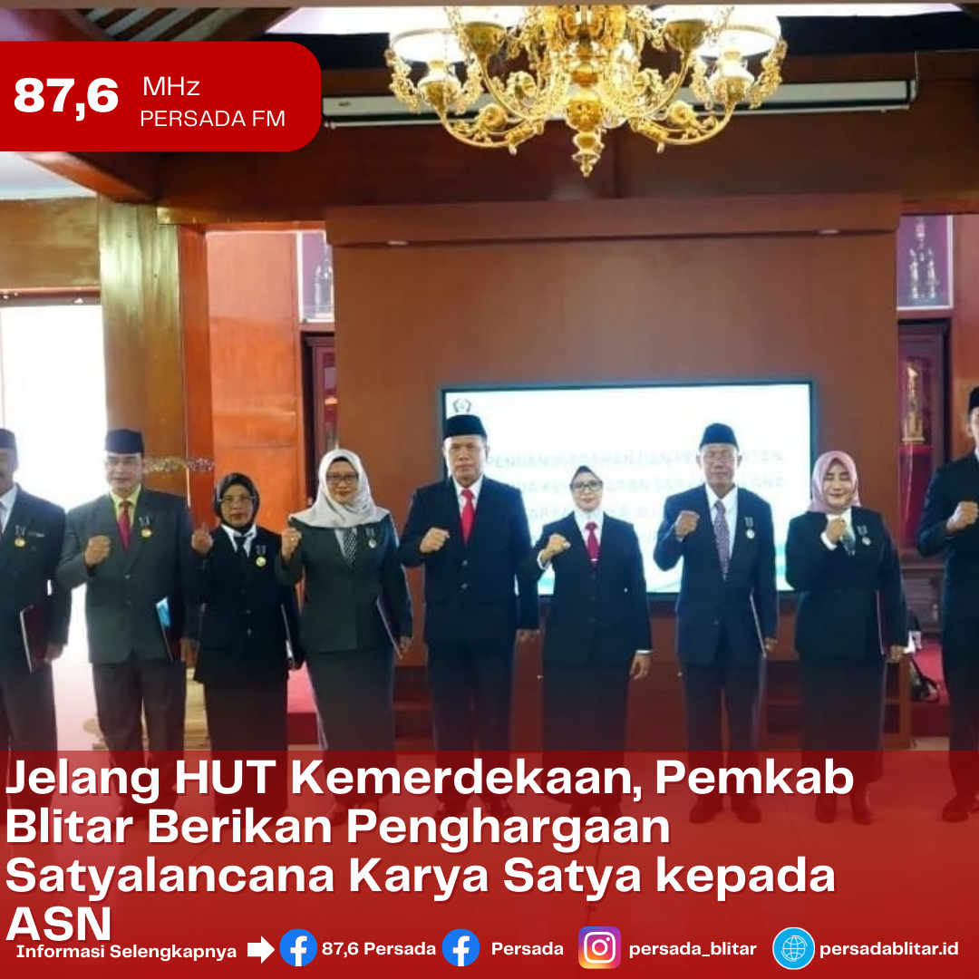 PersadaFM – Menjelang HUT Kemerdekaan RI Tahun 2023, Pemkab Blitar menganugerahkan dan menyematkan tanda kehormatan Satyalancana Karya Satya kepada ASN di lingkungan Pemerintah Kabupaten Blitar. Acara itu berlangsung di Pendopo Ronggo Hadi Negoro, Senin (14/08/2023).