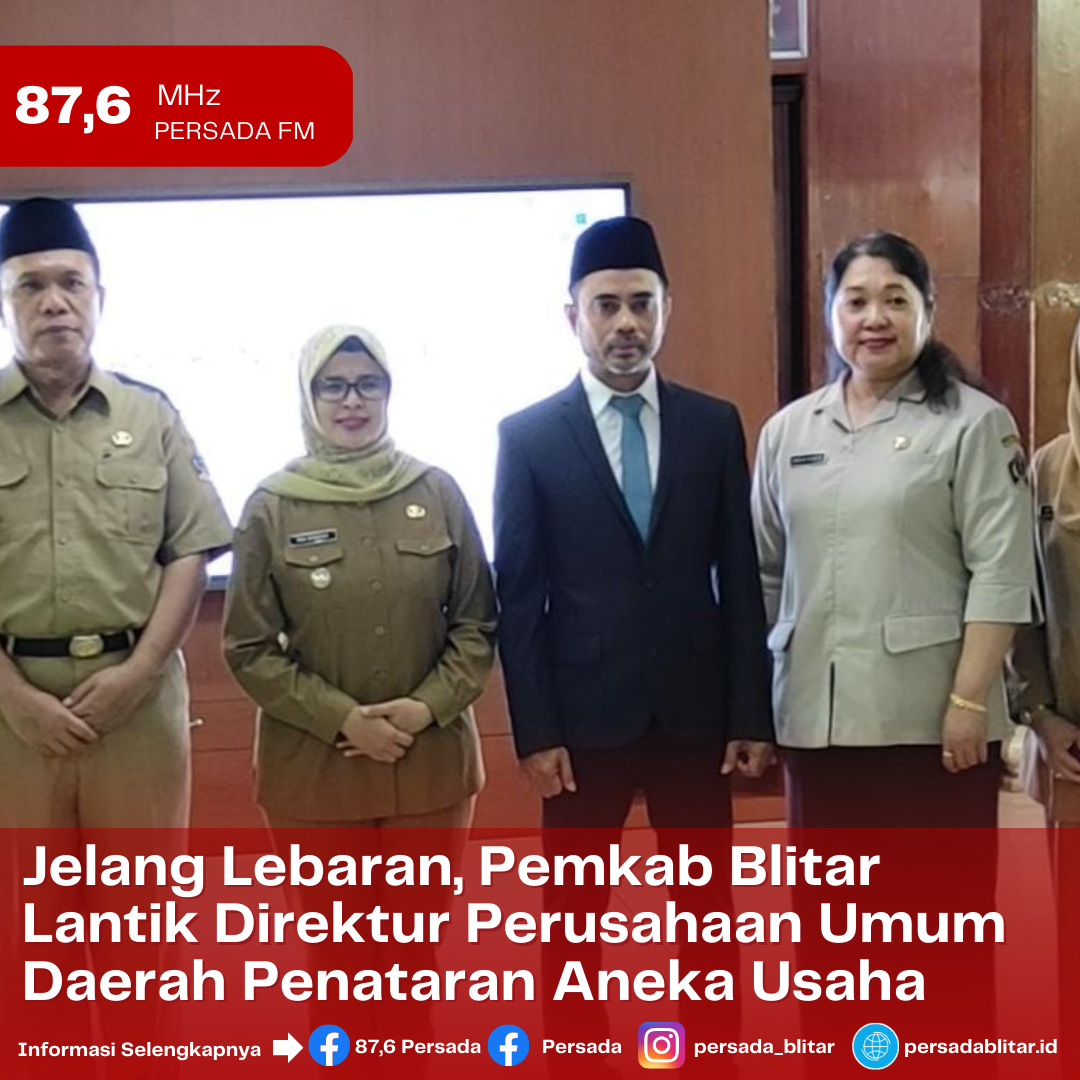 PersadaFM – Pemerintah Kabupaten Blitar secara resmi melantik Direktur Perusahaan Umum Daerah Penataran Aneka Usaha atas nama Hariyono di Pendopo Ronggo Hadi Negoro, (RHN), Senin (10/04/2023). Dalam acara itu, dihadiri langsung Bupati Blitar Rini Syarifah, Sekretaris Daerah Kabupaten Blitar Izul Marom dan sejumlah Kepala OPD di Pemkab Blitar. Bupati menyampaikan, saat ini jajaran Perusahaan Umum Daerah Penataran Aneka Usaha sudah komplit mulai dari Dewan Pengawas dan Direktur sehingga diminta bisa bersinergi membawa perubahan baru terutama perusahaan daerah ini makin maju. Ia menuturkan, bukan hanya jasa yang harus dijalankan namun seluruh potensi yang ada di Kabupaten Blitar ini harus dijadikan obyek bisnis, mulai dari sektor pertanian, perkebunan dan peternakan. Intinya, Perusahaan Umum Daerah Penataran Aneka Usaha memanfaatkan peluang. Ia menambahkan, adanya pelantikan ini, jajaran direksi yang baru segera gerak cepat melaksanakan tugas sehingga, Perusahaan Umum Daerah Penataran Aneka Usaha bisa eksis kembali dan memberikan kontribusi positif bagi Kabupaten Blitar. (ahs/riz)