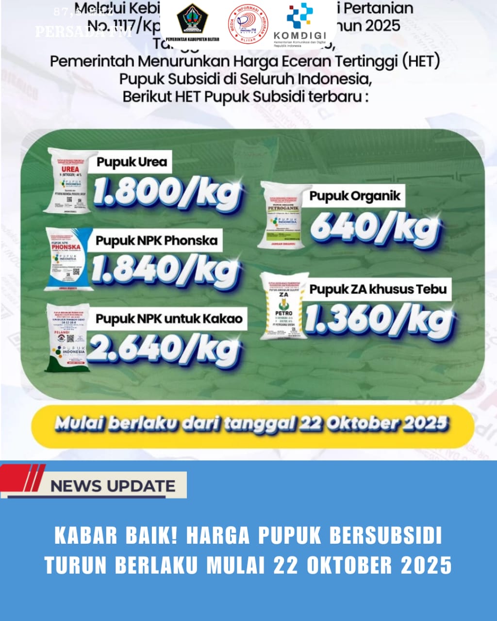 PersadaFM – Kabar gembira bagi para petani di Kabupaten Blitar. Pemerintah melalui Kementerian Pertanian Republik Indonesia resmi menurunkan harga eceran tertinggi (HET) pupuk bersubsidi untuk sektor pertanian. Kebijakan ini mulai berlaku sejak 22 Oktober 2025, sebagaimana tertuang dalam Keputusan Menteri Pertanian Nomor 1117/Kpts./SR.310/M/10/2025.
