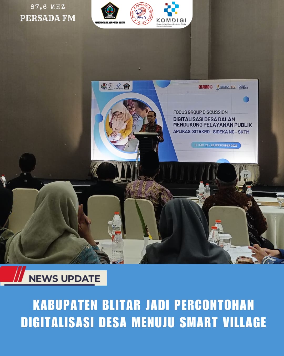 PersadaFM – Kabupaten Blitar ditetapkan sebagai salah satu daerah percontohan dalam penerapan program digitalisasi desa. Hal ini ditegaskan dalam Forum Group Discussion (FGD) Digitalisasi Desa pada Rabu-Kamis 24-25 September 2025, di Hotel Santika, dengan dukungan penuh dari Kementerian Komunikasi dan Digital (Komdigi) serta Kementerian Desa, Pembangunan Daerah Tertinggal, dan Transmigrasi.