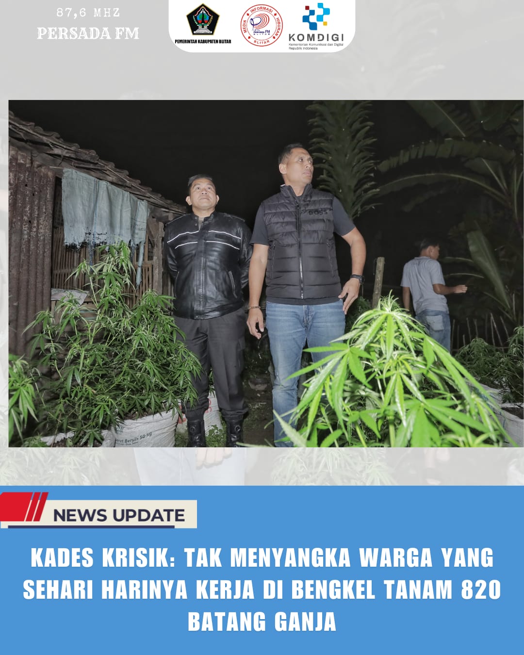 PersadaFM – Kepala Desa Krisik, Kecamatan Gandusari, Kabupaten Blitar, Hari Budi Setiawan, mengaku terkejut setelah Polres Blitar Kota menemukan ratusan batang ganja di wilayahnya. Polisi mengamankan 820 batang ganja berbagai ukuran yang ditanam oleh SA (38), seorang warga desa yang sehari-hari bekerja di bengkel.