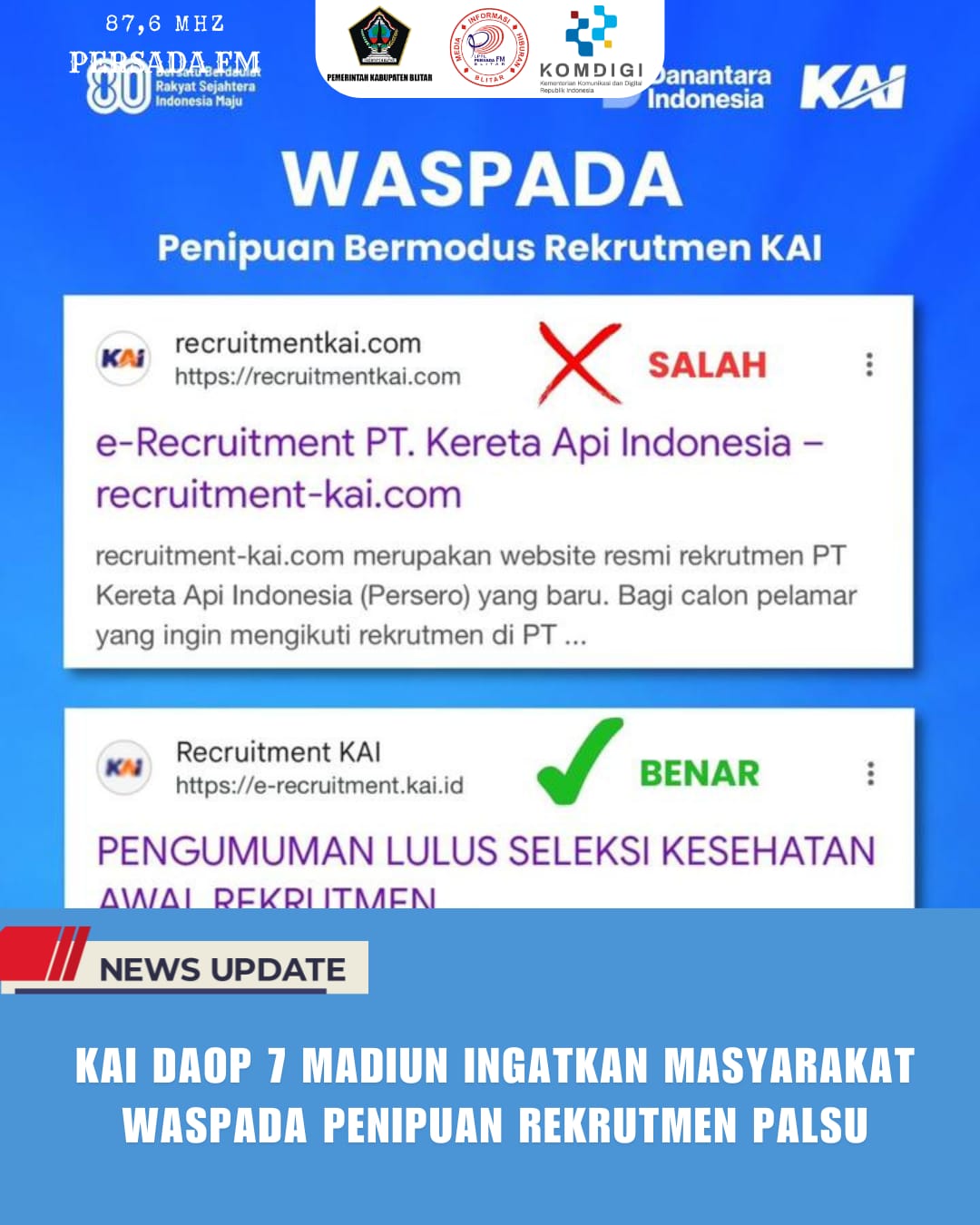 PersadaFM – PT Kereta Api Indonesia (Persero) Daerah Operasi 7 (Daop 7) Madiun mengimbau masyarakat agar lebih waspada terhadap penipuan berkedok rekrutmen pegawai yang mengatasnamakan KAI. Peringatan ini disampaikan setelah beredar situs dan akun palsu yang menawarkan lowongan kerja fiktif pasca penutupan rekrutmen resmi KAI pada 3 September 2025 lalu.