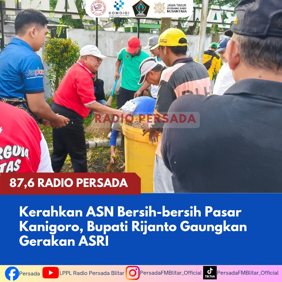 PersadaFM – Bupati Blitar, Rijanto, memimpin kegiatan kerja bakti bersama Aparatur Sipil Negara (ASN) di lingkungan Pemerintah Kabupaten Blitar di kawasan Pasar Kanigoro, Jumat (06/03/2026). Kegiatan tersebut dilakukan untuk mewujudkan lingkungan pasar yang ASRI (Aman, Sehat, Resik, dan Indah).