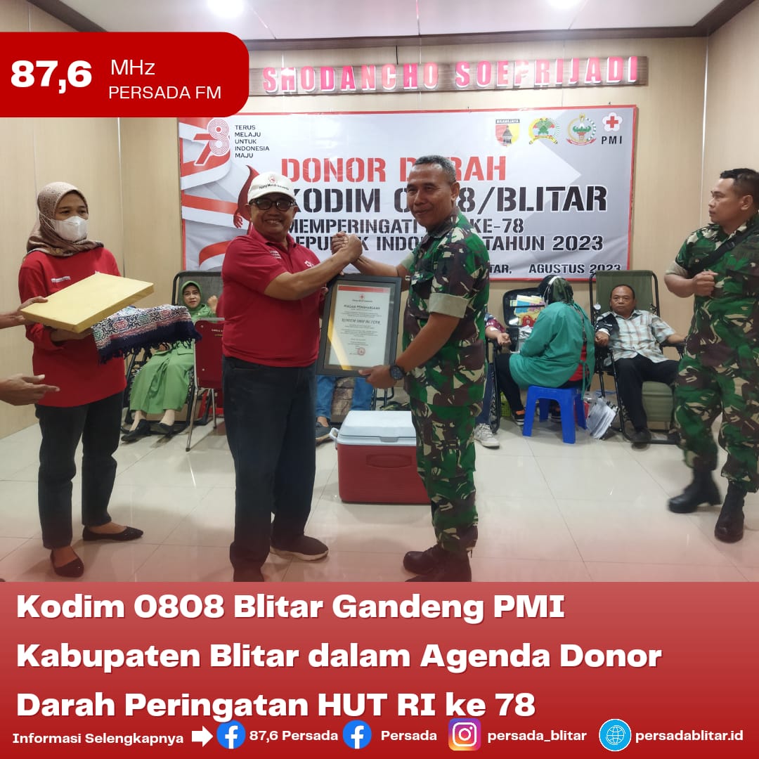 PersadaFM – Peringati Hari Ulang Tahun Republik Indonesia (HUT RI) ke 78, Komando Distrik Militer (Kodim) 0808 bersama Unit Donor Darah Palang Merah Indonesia (UDD PMI) Kabupaten Blitar laksanakan donor darah. Kegiatan dilakukan pada Jum’at (11/8/2023) di aula Shodanco Soeprijadi Kodim 0808 Blitar.