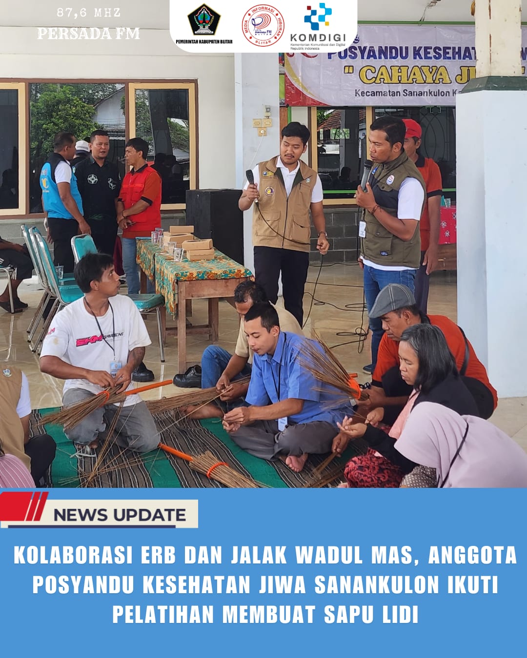 PersadaFM — Anggota Posyandu Kesehatan Jiwa Cahaya Jiwa, Kecamatan Sanankulon, Kamis (23/10), mengikuti pelatihan keterampilan membuat sapu lidi di Desa Kalipucung. Kegiatan ini merupakan hasil kolaborasi antara Edukasi Remaja Tangguh Berbasis Komunitas (ERB) UPT PSBR Blitar dan komunitas Jalak Wadul Mas RSBL Kediri.