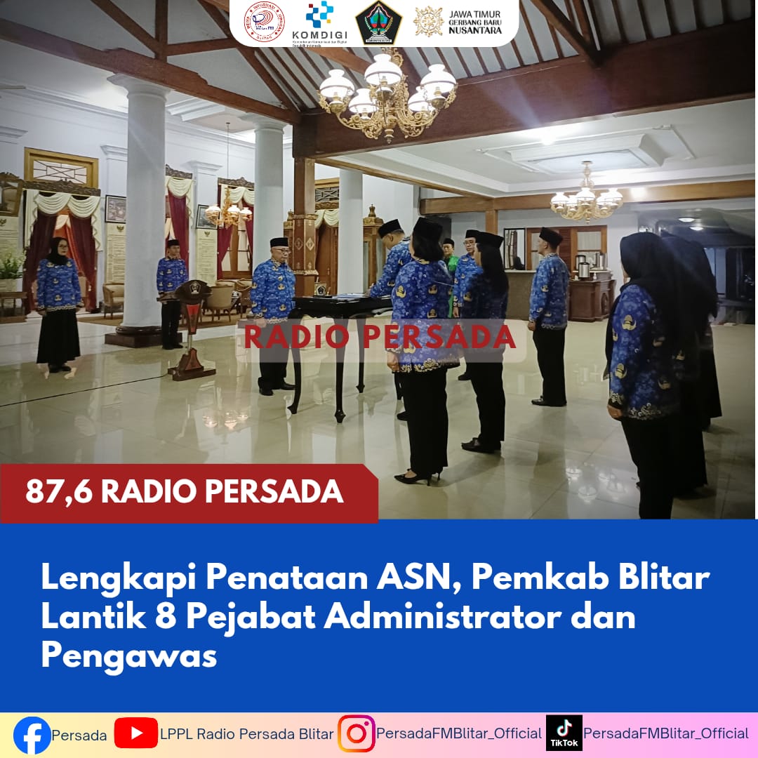 PersadaFM — Pemerintah Kabupaten Blitar melantik delapan pejabat administrator dan pengawas dalam rangka melengkapi penataan aparatur sipil negara (ASN), Kamis malam (12/02), di Pendopo Ronggohadinegoro.