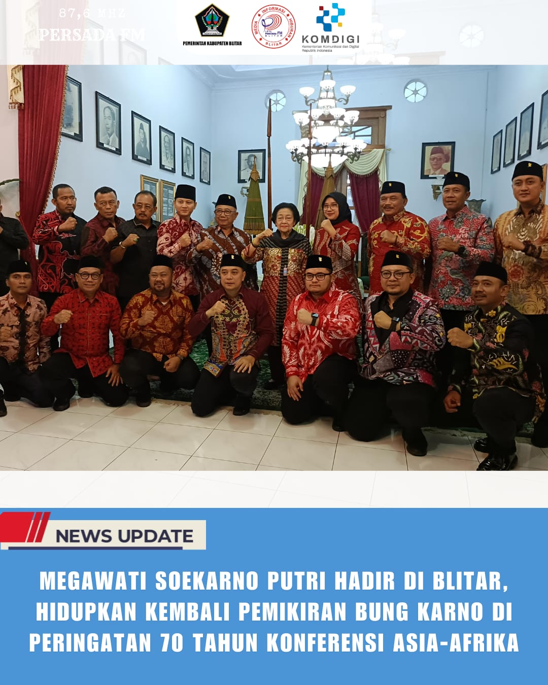 PersadaFM – Ketua Umum PDI Perjuangan sekaligus Presiden ke-5 Republik Indonesia, Prof. Dr. Megawati Soekarno Putri, hadir di Blitar pada 31 Oktober–1 November 2025 untuk memperingati 70 tahun Konferensi Asia-Afrika. Kegiatan ini menjadi momentum penting untuk menghidupkan kembali pemikiran Bung Karno, terutama tentang kepemimpinan, keadilan, dan semangat anti-penjajahan.