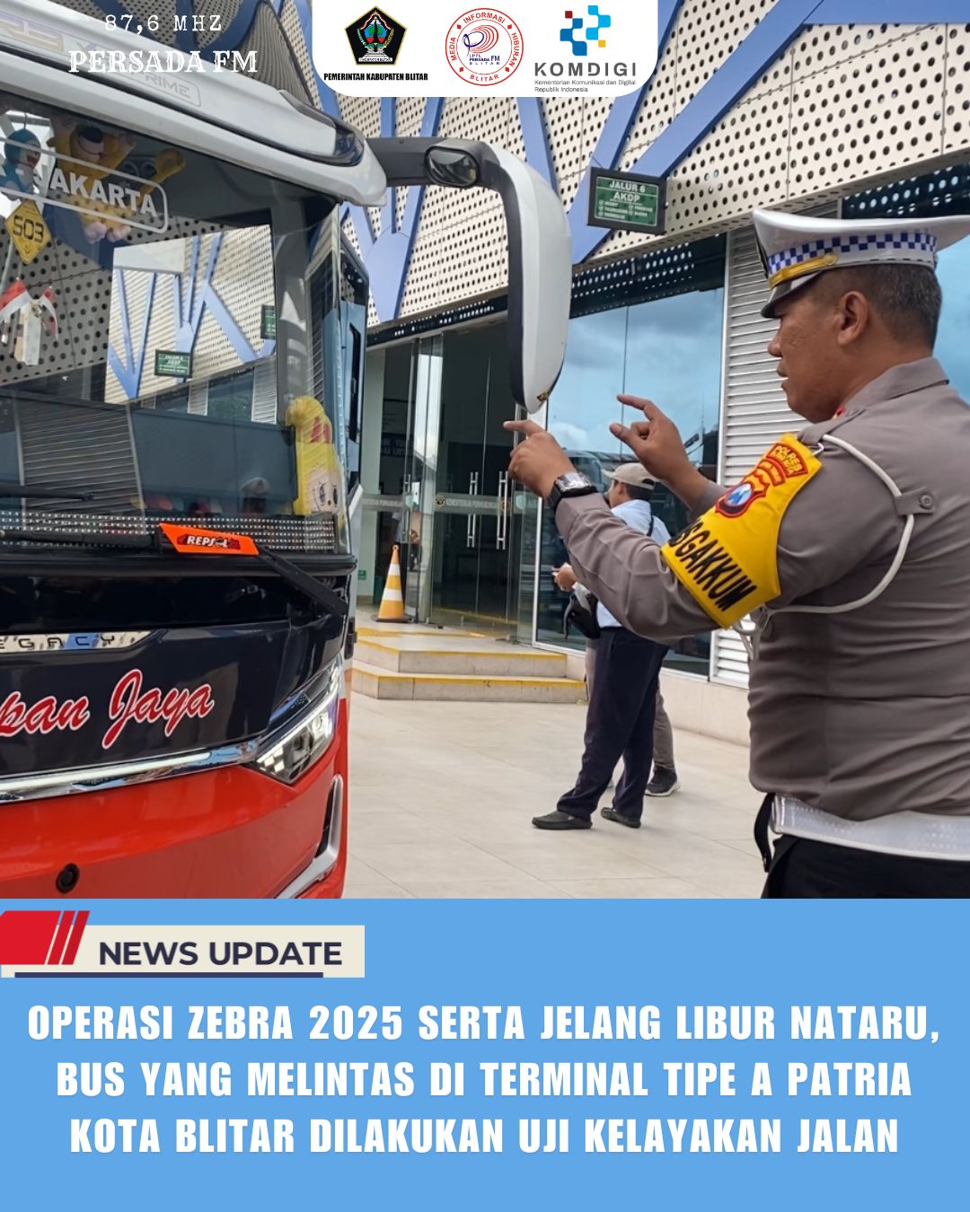PersadaFM – Masuki masa operasi zebra 2025, personel gabungan dari Sat Lantas Polres Blitar Kota bersama Kementerian Perhubungan dalam Negeri gelar inspeksi kendaraan atau Ramp Check di Terminal Tipa A Patria, Blitar pada Senin (17/11/2025). Ramp Check kali ini sekaligus untuk menguji kelayakan jalan setiap armada bus, menjelang libur natal dan tahun baru (Nataru).