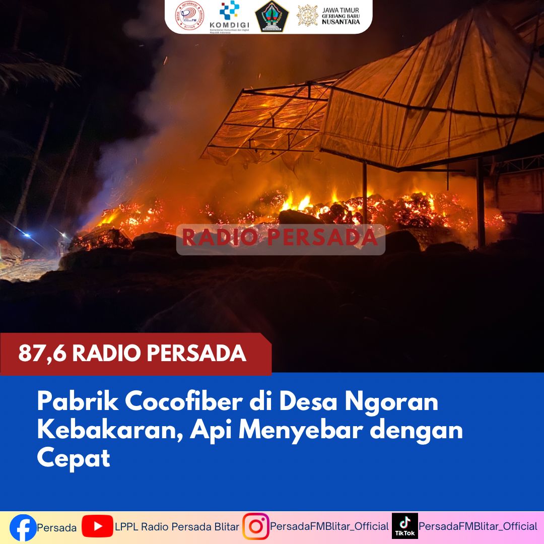 PersadaFM – Sebuah pabrik sabut kelapa di Desa Ngoran, Kecamatan Nglegok, Kabupaten Blitar terbakar, Kamis (23/4/2026) malam. Salah satu saksi kejadian menceritakan awal mula kebakaran terjadi sekitar pukul 21.00 WIB. Dari pantauan di lokasi, api terus membesar hingga petugas pemadam kebakaran harus bolak balik mengisi tangki air mobil.