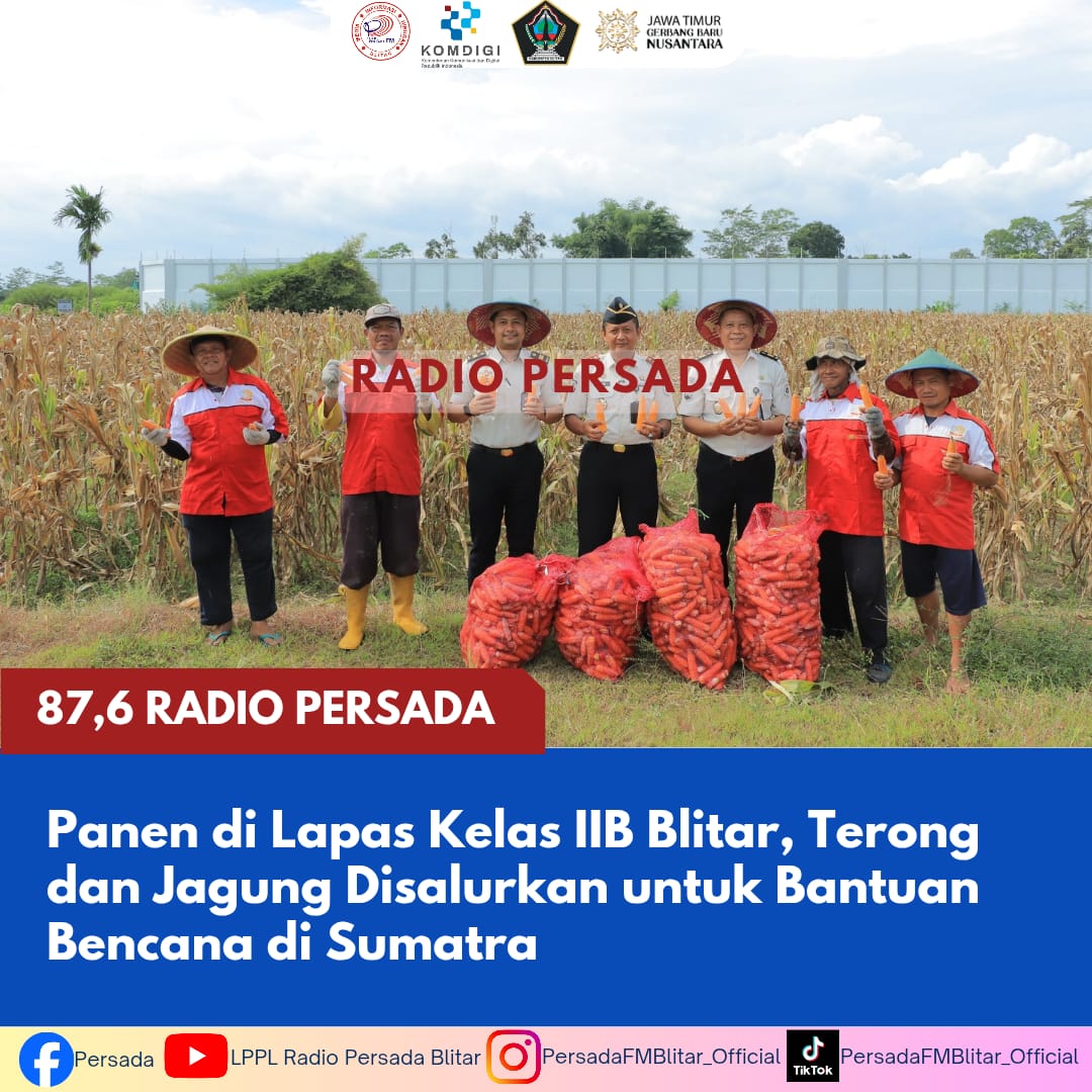 PersadaFM — Lembaga Pemasyarakatan (Lapas) Kelas IIB Blitar melaksanakan panen terong dan jagung dari program pembinaan kemandirian warga binaan. Sebagian hasil panen tersebut disalurkan untuk bantuan kemanusiaan bagi masyarakat terdampak bencana alam di Sumatra, Kamis (15/01).