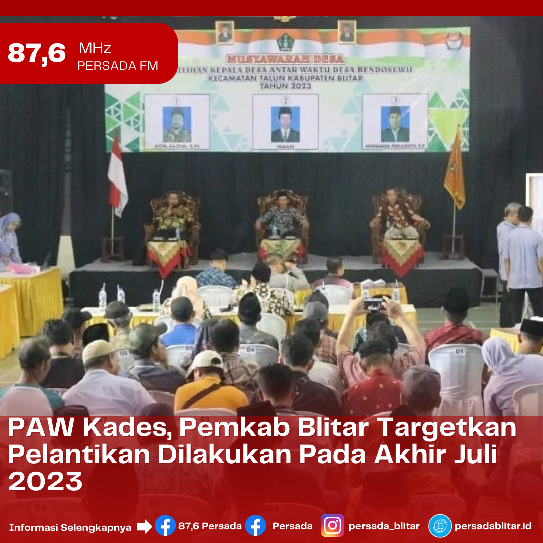 PersadaFM – Pemilihan Kepala Desa (Kades) Pengganti Antar Waktu (PAW) di Kabupaten Blitar sudah digelar pada 27 Juni 2023 yang lalu. Totalnya ada lima Desa di Kabupaten Blitar bakal menggelar pemilihan Kades PAW. Meliputi, Desa Resapombo Kecamatan Doko, Desa Ringinanyar Kecamatan Ponggok, Desa Selokajang Kecamatan Srengat, Desa Bendosewu Kecamatan Talun dan Desa Ngadri Kecamatan Binangun.