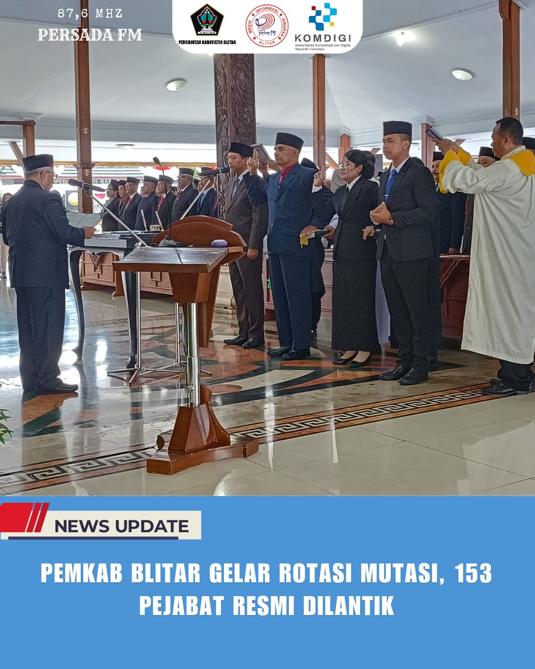 PersadaFM – Pemerintah Kabupaten Blitar menata ulang struktur birokrasi dengan melaksanakan rotasi dan mutasi pejabat, Jumat (29/8/2025). Sebanyak 153 pejabat struktural dilantik, meliputi 15 Jabatan Pimpinan Tinggi (JPT) Pratama, 79 administrator, dan 59 pengawas.