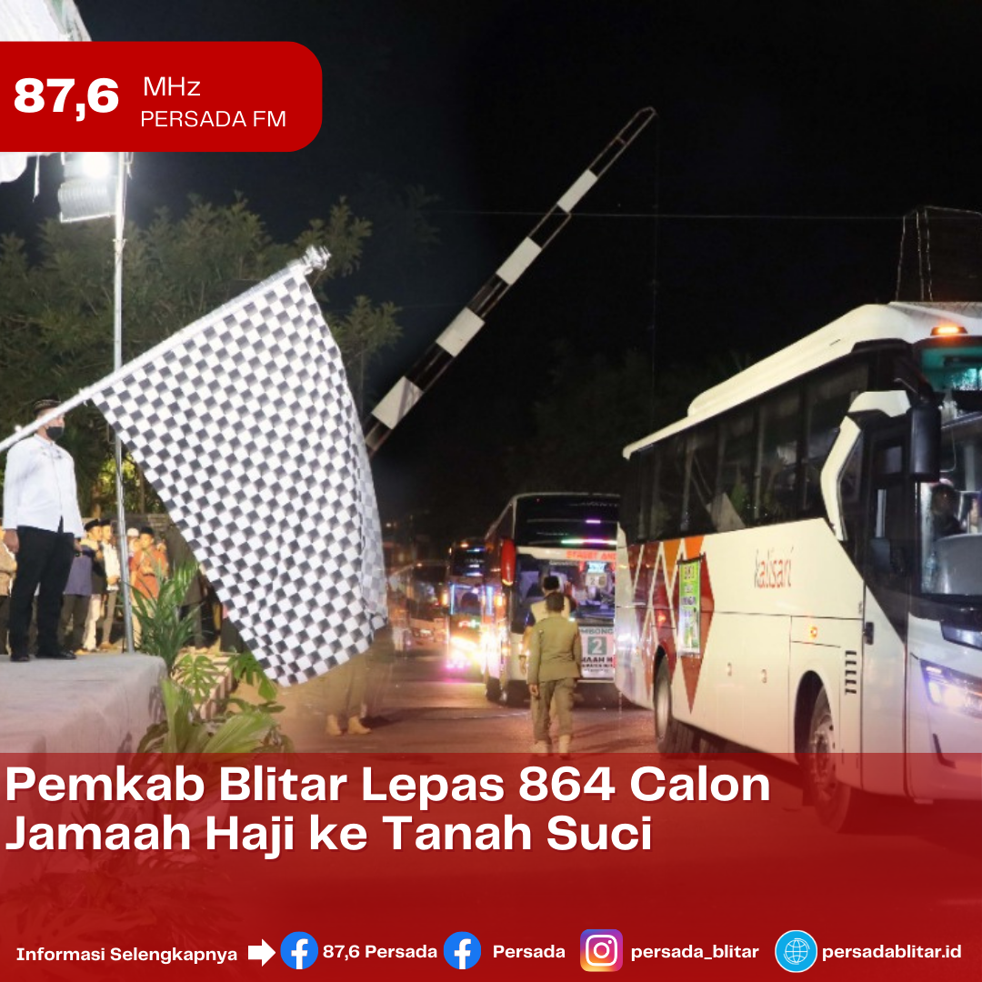 PersadaFM – Pemerintah Kabupaten Blitar melepas 864 Calon Jamaah Haji (CJH) menuju Asrama Haji Sukolilo Surabaya, Minggu (28/05/2023). Dalam kegiatan tersebut, dihadiri langsung oleh Bupati Blitar Rini Syarifah, Sekretaris Daerah Kabupaten Blitar Izul Marom, Wakil DPRD Kabupaten Blitar dan sejumlah ASN Pemkab Blitar.
