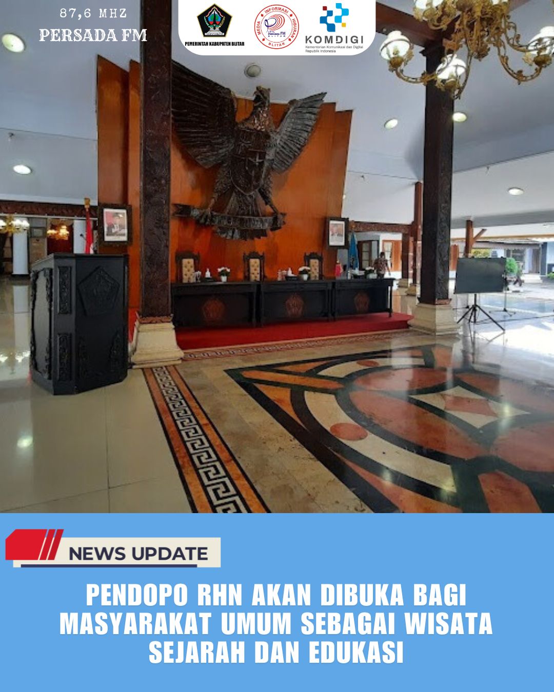 PersadaFM – Pendopo Ronggo Hadinegoro kembali akan dibuka bagi masyarakat umum setiap hari Minggu. Hal itu diungkapkan Kepala Dinas Kebudayaan dan Pariwisata (Disbudpar) Kabupaten Blitar, Suhendro Winarso.