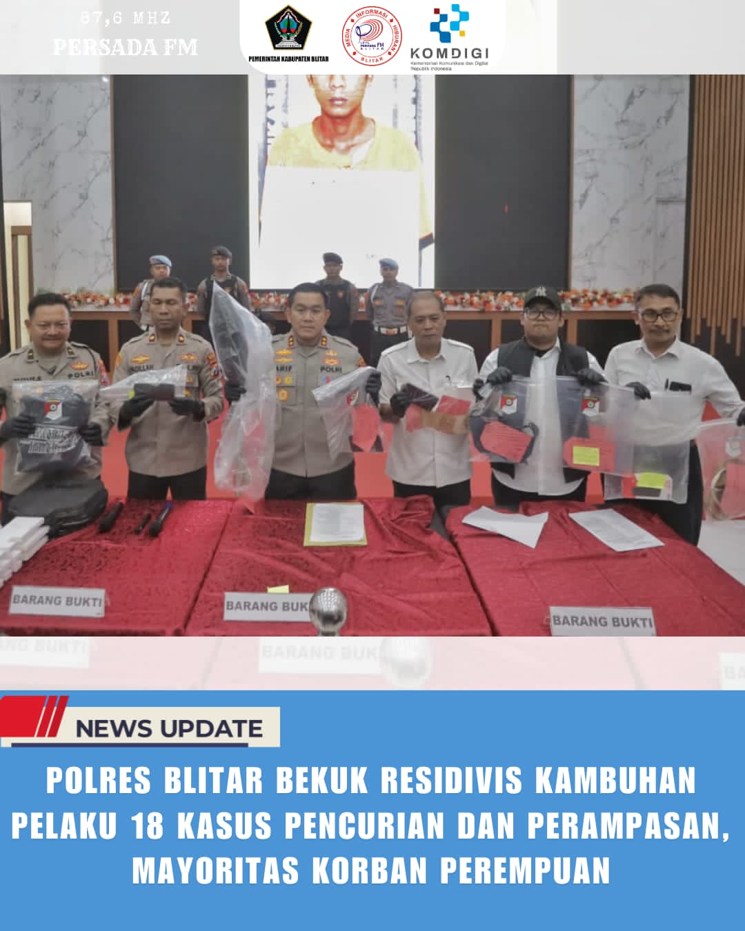 PersadaFM – Kepolisian Resor Blitar kembali mencatat prestasi dalam menjaga keamanan wilayah dengan berhasil mengungkap 18 kasus tindak pidana pencurian dan perampasan yang dilakukan oleh satu orang pelaku. Pelaku diketahui merupakan residivis kambuhan berinisial D.A (28), warga Dusun Krisik, Desa Krisik, Kecamatan Gandusari, Kabupaten Blitar.