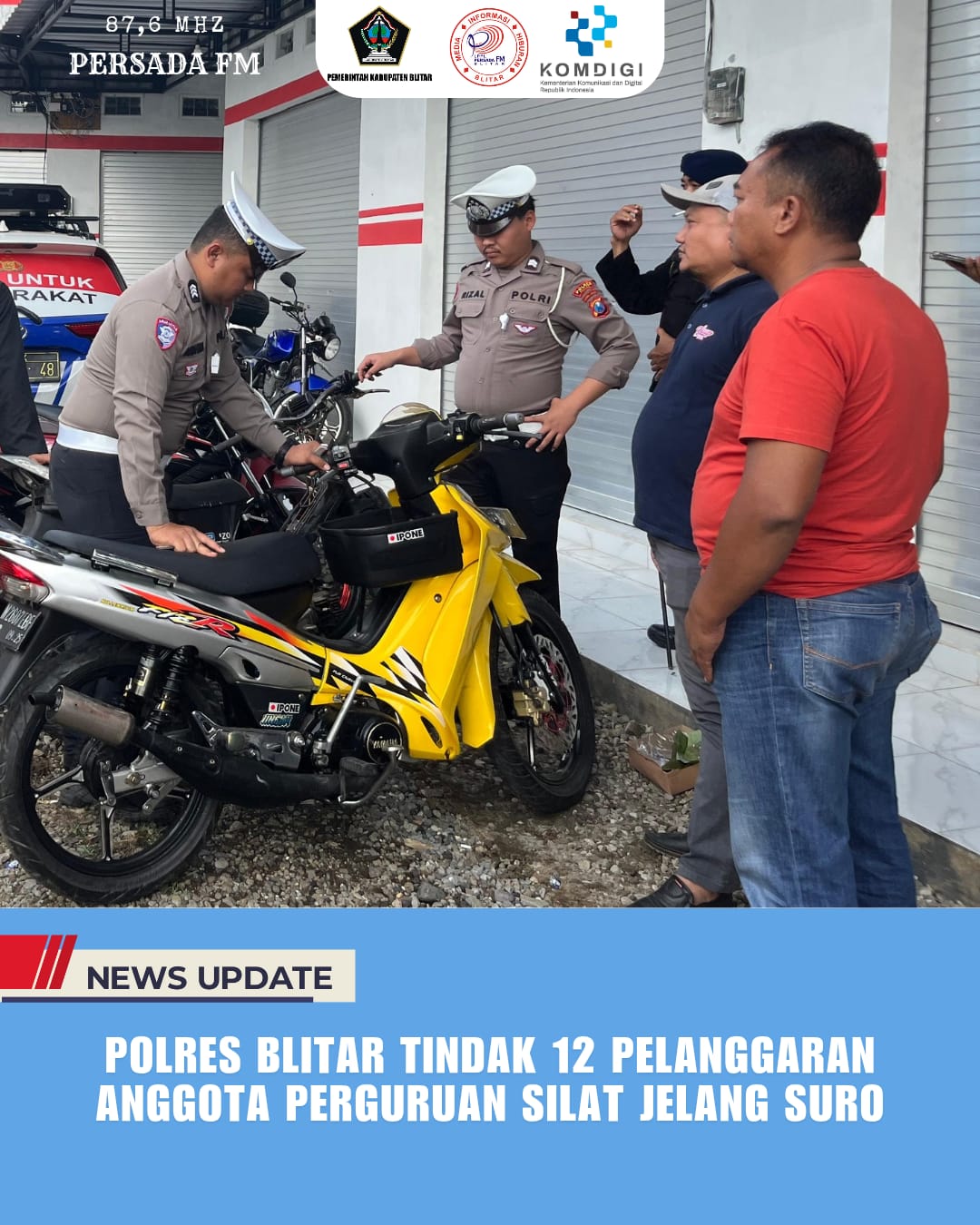 PersadaFM — Polres Blitar menindak 12 pelanggaran yang dilakukan oleh anggota perguruan silat dalam rangkaian pengamanan menjelang tradisi Suro, Minggu (8/6/2025). Penindakan dilakukan sebagai bentuk pelaksanaan Maklumat Aman Suro 2025 yang bertujuan menjaga keamanan dan ketertiban masyarakat.