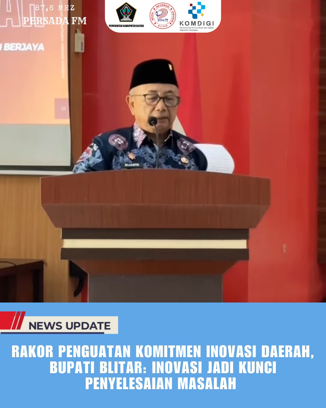 PersadaFM – Perkuat sinergi dan kolaborasi lintas sektor untuk menciptakan ekosistem inovasi di daerah, Pemerintah Kabupaten Blitar menggelar Rapat Koordinasi Penguatan Komitmen Inovasi Daerah Tahun 2025. Kegiatan ini dilaksanakan pada Kamis (5/6/2025) di Aula Garuda Dinas Pendidikan Kabupaten Blitar dan dibuka langsung oleh Bupati Blitar, Rijanto.