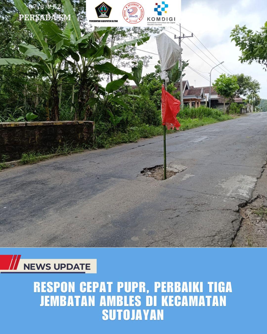 PersadaFM – Dapati laporan tiga jembatan di Desa Kaulon, Kecamatan Sutojayan, Kabupaten Blitar ambles, Dinas Pekerjaan Umum dan Penataan Ruang (PUPR) Kabupaten Blitar langsung bergerak lakukan perbaikan. Perbaikan ini dilakukan menggunakan dana Unit Reaksi Cepat (URC).