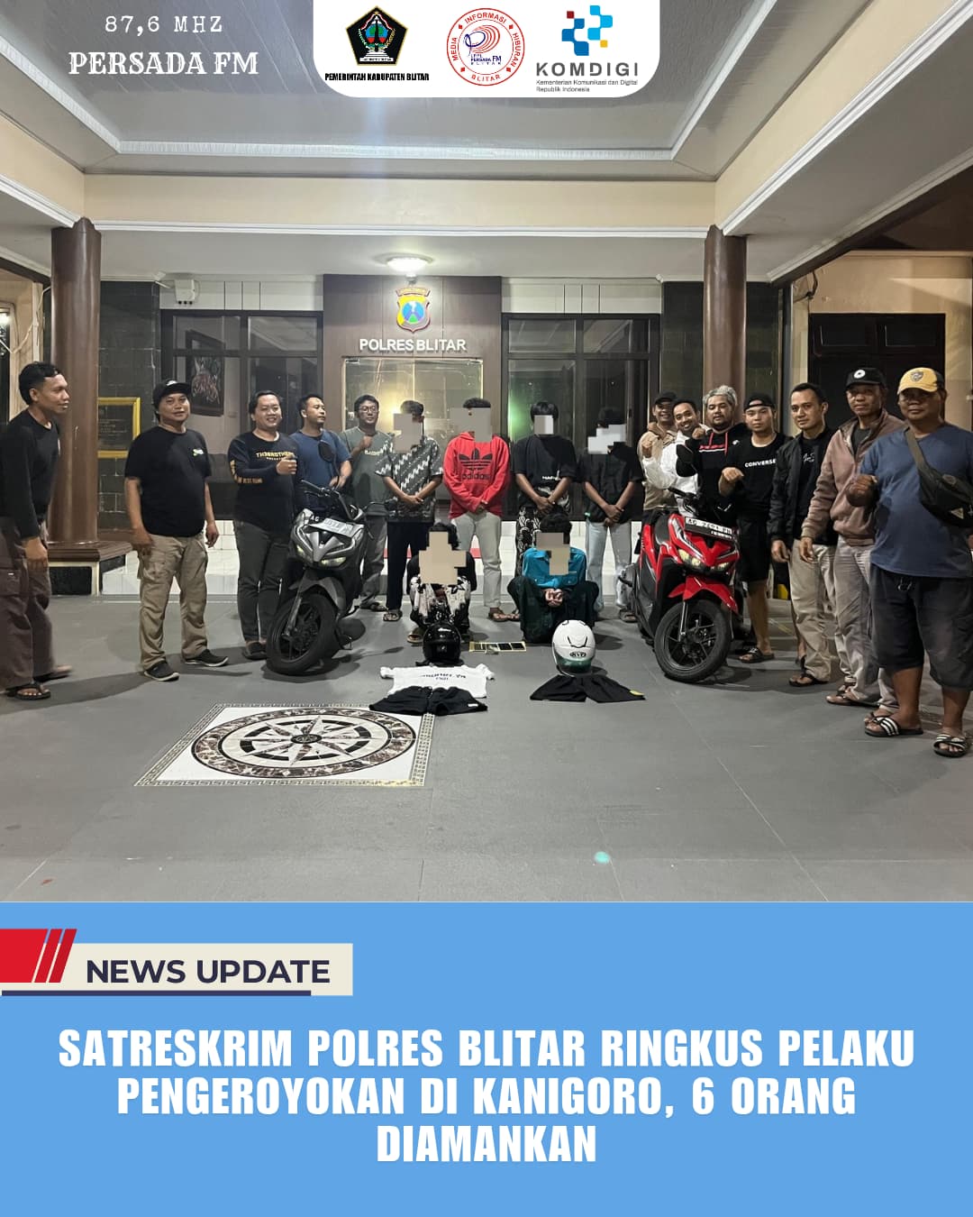PersadaFM – Satreskrim Polres Blitar mengamankan enam orang terduga pelaku pengeroyokan yang terjadi di wilayah Kanigoro, Kabupaten Blitar. Kejadian ini melibatkan oknum dari salah satu perguruan silat dan sempat viral di media sosial karena terekam dalam sebuah video yang beredar luas.