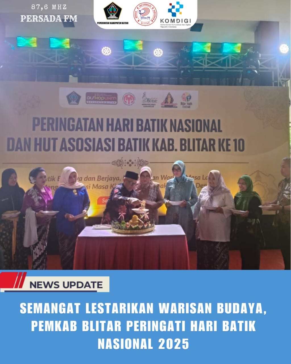 PersadaFM – Pemerintah Kabupaten Blitar menggelar peringatan Hari Batik Nasional Tahun 2025 yang dirangkai dengan HUT ke-10 Asosiasi Pengrajin Batik Kabupaten Blitar (APBB). Acara ini menjadi momentum untuk memperkuat komitmen dalam melestarikan Batik Motif Cakra Palah sebagai identitas dan kebanggaan daerah.