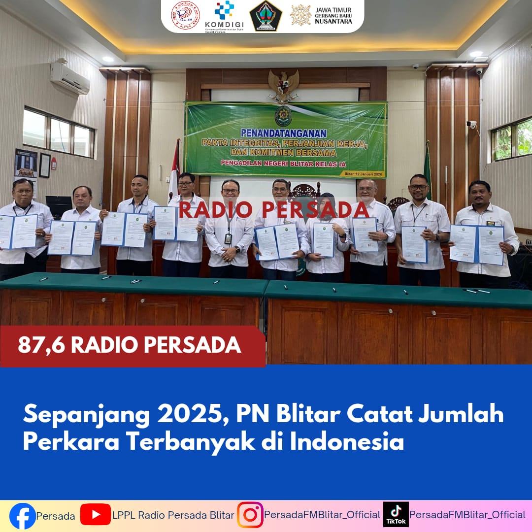 PersadaFM – Pengadilan Negeri (PN) Kelas IA Blitar ditetapkan Mahkamah Agung (MA) sebagai pengadilan dengan jumlah perkara terbanyak di Indonesia sepanjang 2025.