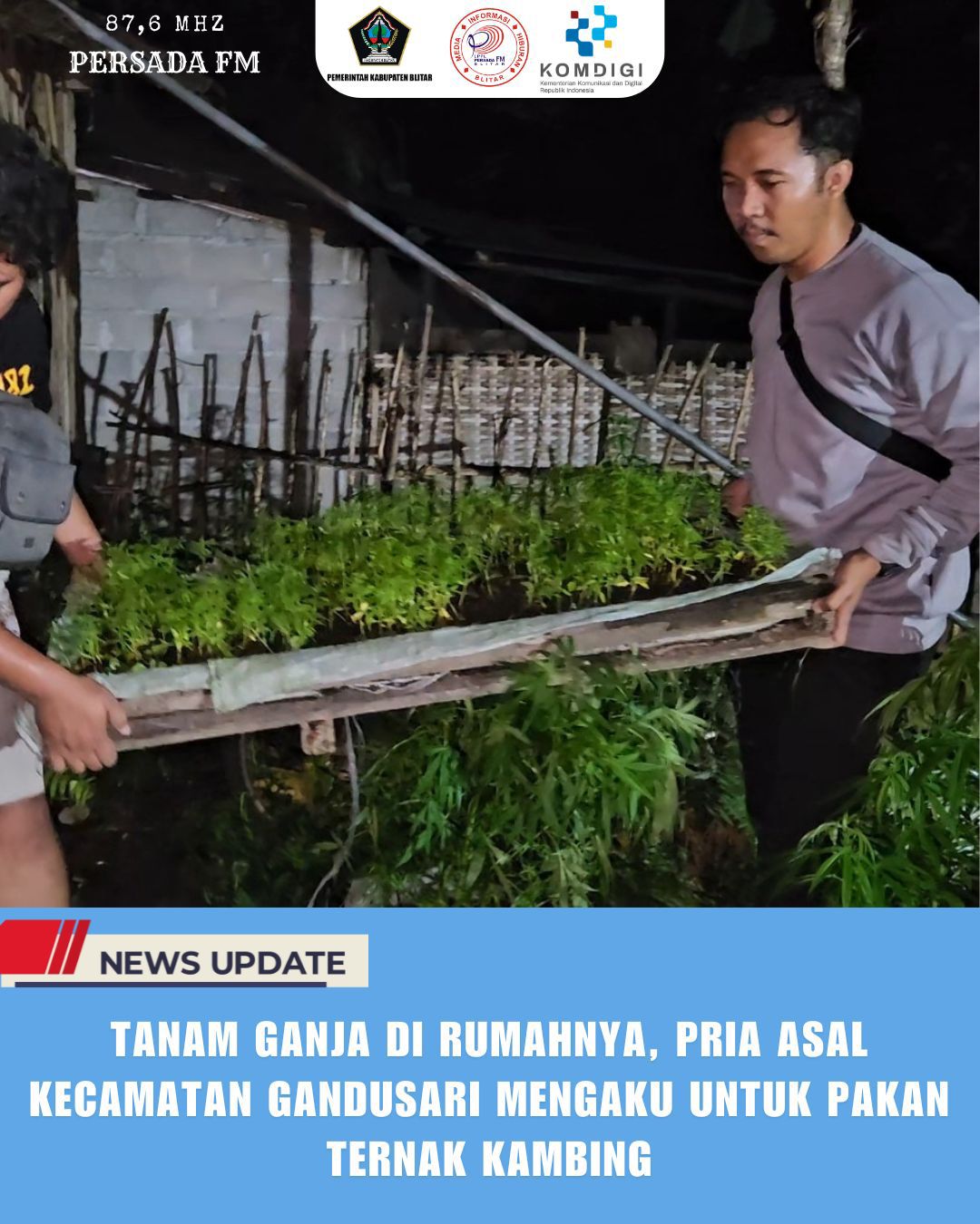 PersadaFM – Pria berinisial SA (38) di Kecamatan Gandusari terbukti menanam ratusan batang ganja di lahan rumahnya. Dalan pengakuannya, SA mengatakan menanam ganja untuk pakan kambing.