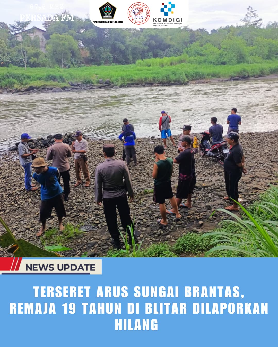 PersadaFM – Seorang remaja laki-laki dilaporkan hilang terseret arus Sungai Brantas saat berenang bersama teman-temannya di wilayah Dusun Gendong, Desa Purworejo, Kecamatan Sanankulon, Kabupaten Blitar, Selasa (27/5) sore.
