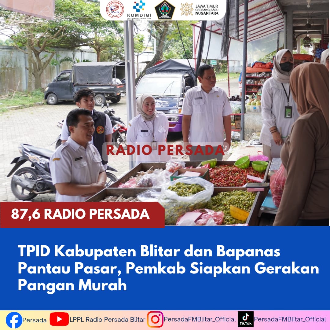 PersadaFM — Tim Pengendali Inflasi Daerah (TPID) Kabupaten Blitar bersama Badan Pangan Nasional (Bapanas) melakukan pemantauan harga dan ketersediaan bahan pokok di Pasar Kanigoro. Pemantauan ini melibatkan unsur dinas terkait yang tergabung dalam TPID, termasuk Dinas Pertanian serta Dinas Perindustrian dan Perdagangan, untuk memastikan stabilitas pangan menjelang bulan Ramadan.
