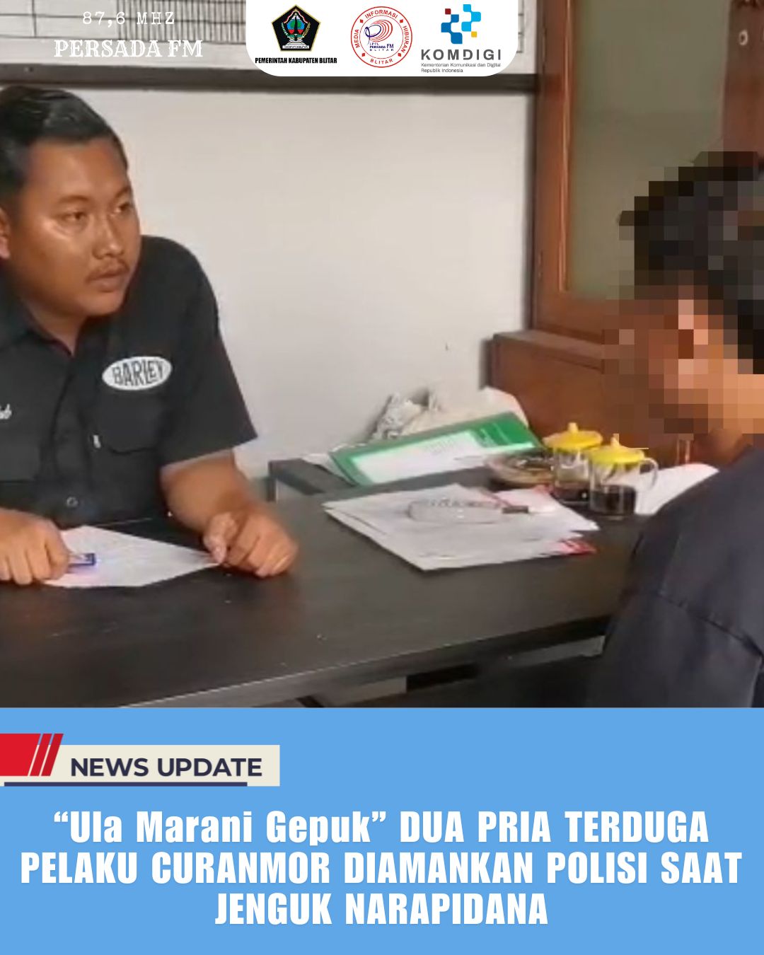 Kapolres Blitar melalui Kasat Reskrim Polres Blitar, AKP Momon Suwito pada Jum’at (13/6/2025) mengungkapkan kedua terduga pelaku tengah menjenguk temannya NY, tersangka kasus curanmor di Rutan Polres Blitar. Kedua terduga pelaku telah dicurigai sehingga dilakukan pemeriksaan dan interogasi singkat oleh petugas.